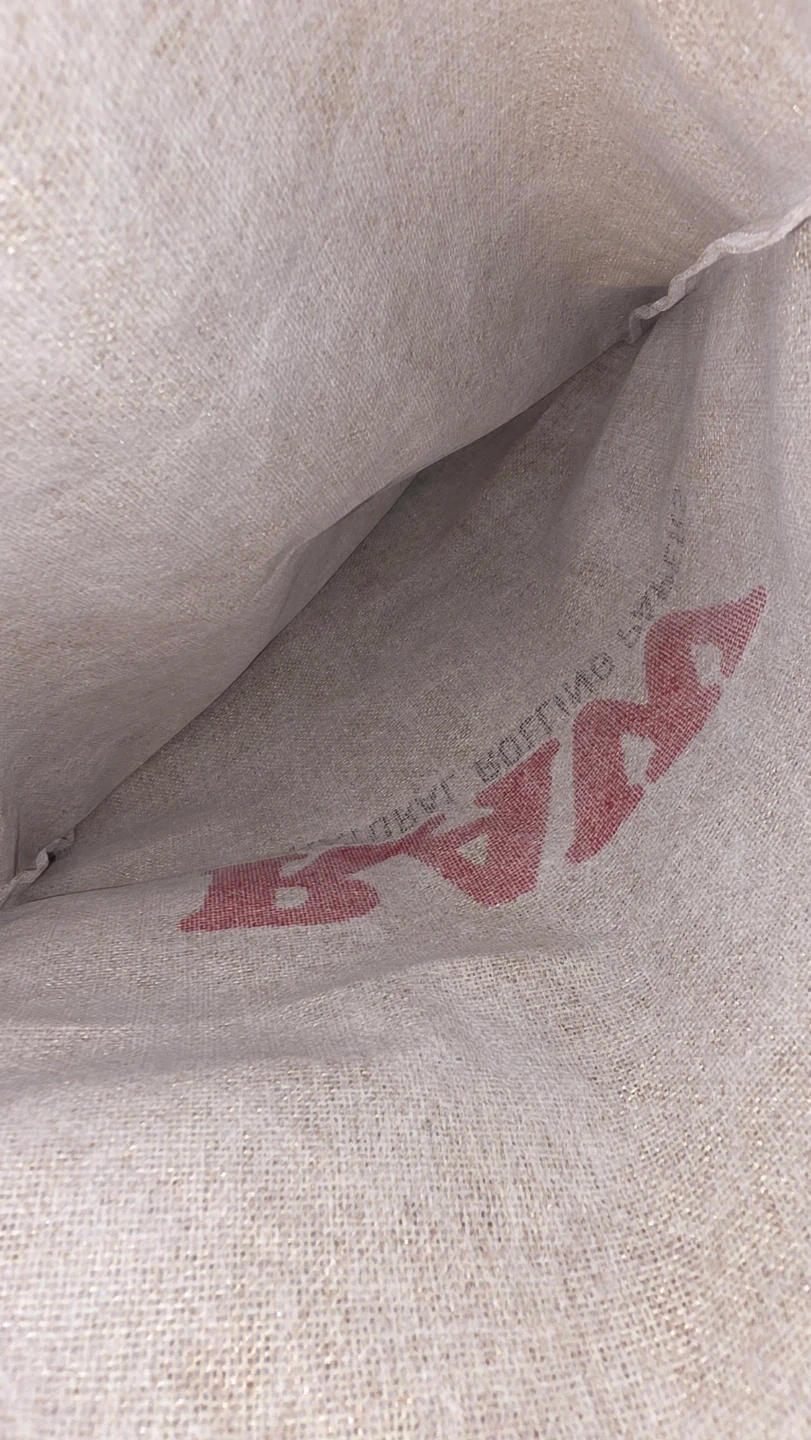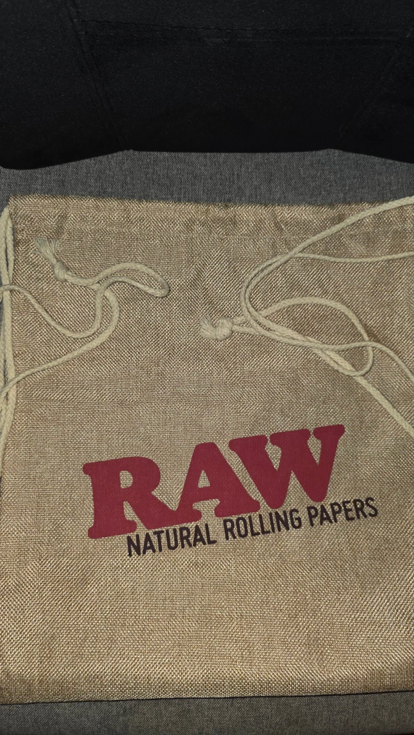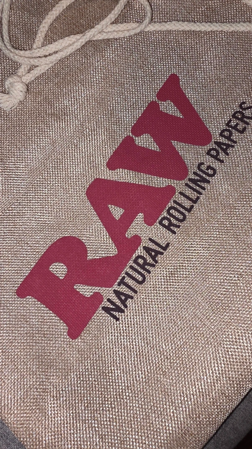 This is a RAW Natural Rolling Papers Tote drawstring bag. It's made from a natural hemp material and has the RAW logo printed on it. It's great for storing smaller items.