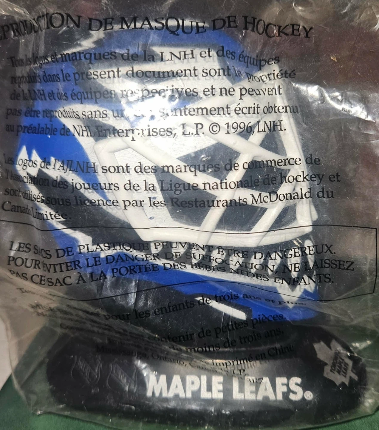 This is a Toronto Maple Leafs mini hockey mask toy. It's a 1996 NHL collectible distributed by McDonald's Canada. It's suitable for children three years and older.