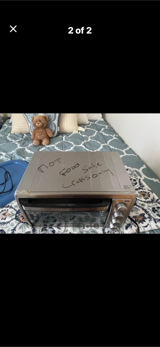 This is a Black and Decker toaster oven. It's labelled 'Not food safe, crafts only'. This would be useful for heating up materials for crafts or other non-food related projects. It has multiple dial controls.
