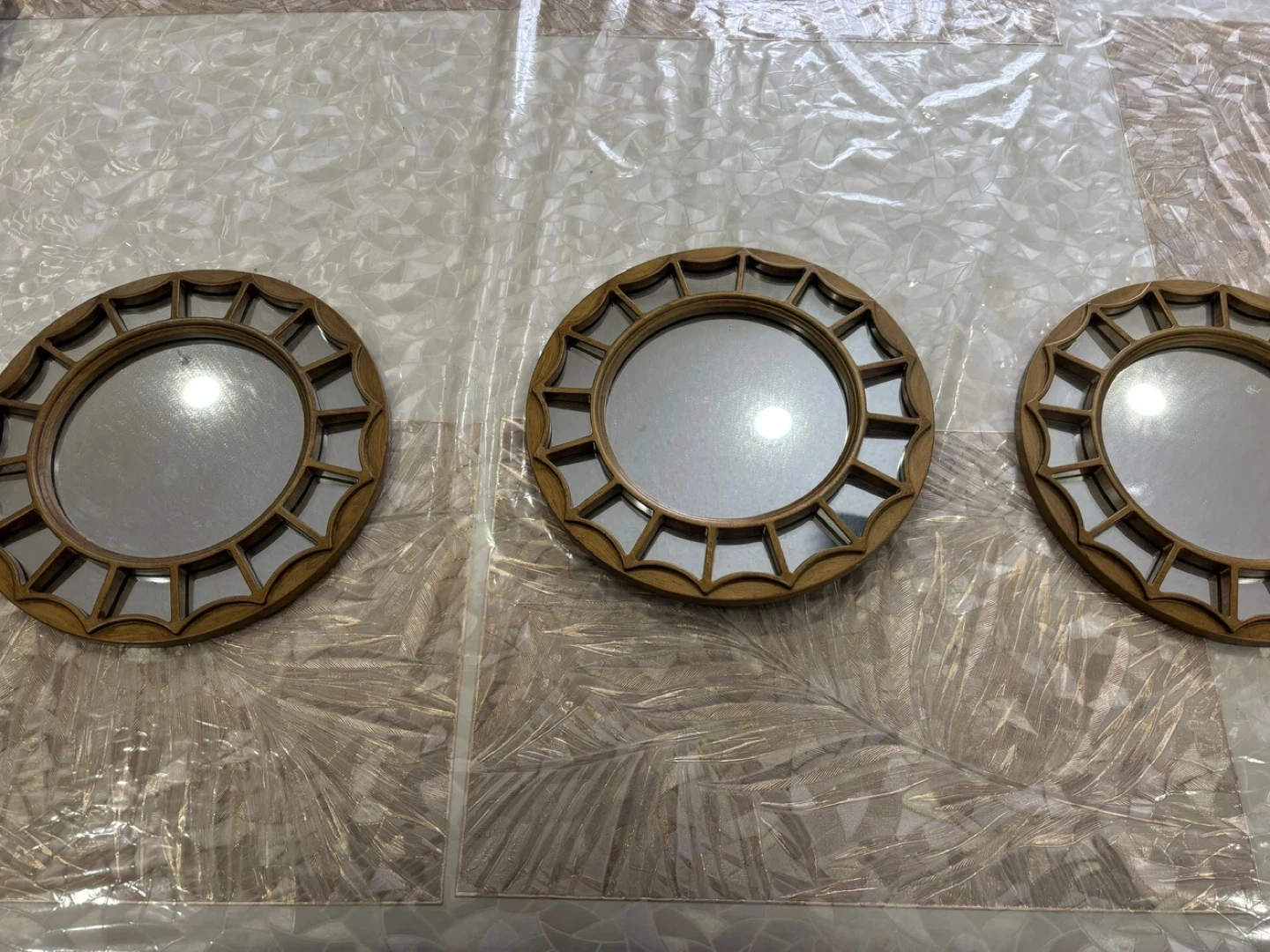 These decorative mirrors have a wooden frame with a sunburst design. They're great for adding a touch of style to any room. Each mirror measures approximately 12 inches in diameter.