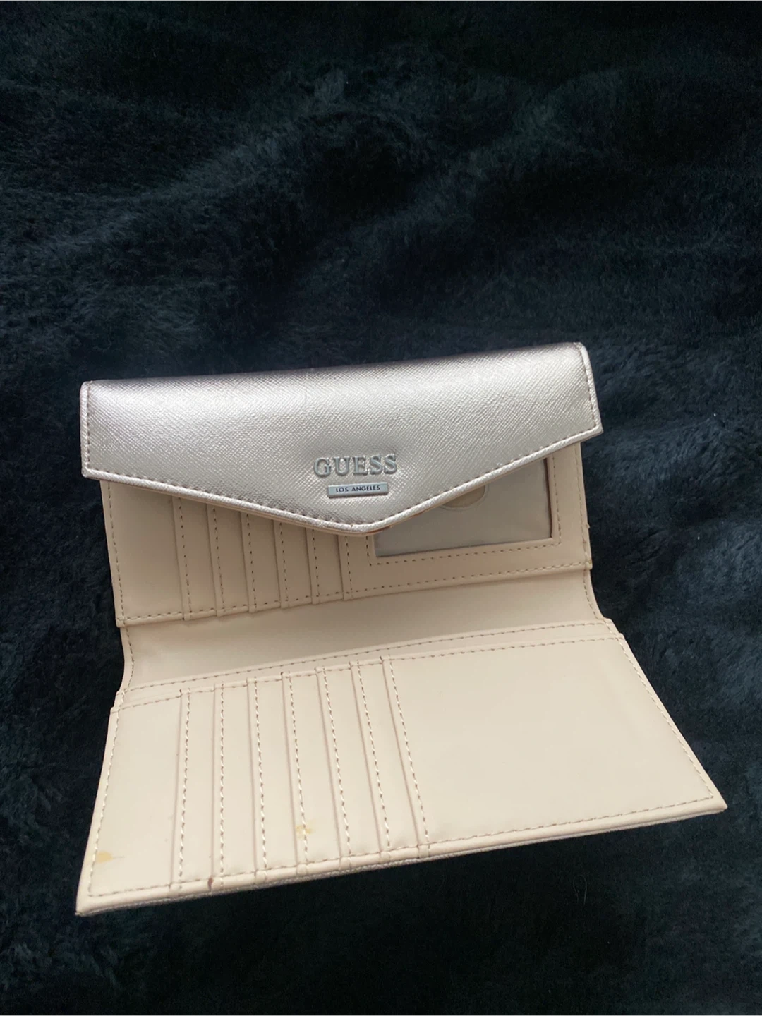 A silver Guess wallet with multiple card slots and an ID window. It's made of faux leather and has a snap closure. This wallet is perfect for keeping your essentials organized. Pick up cash only