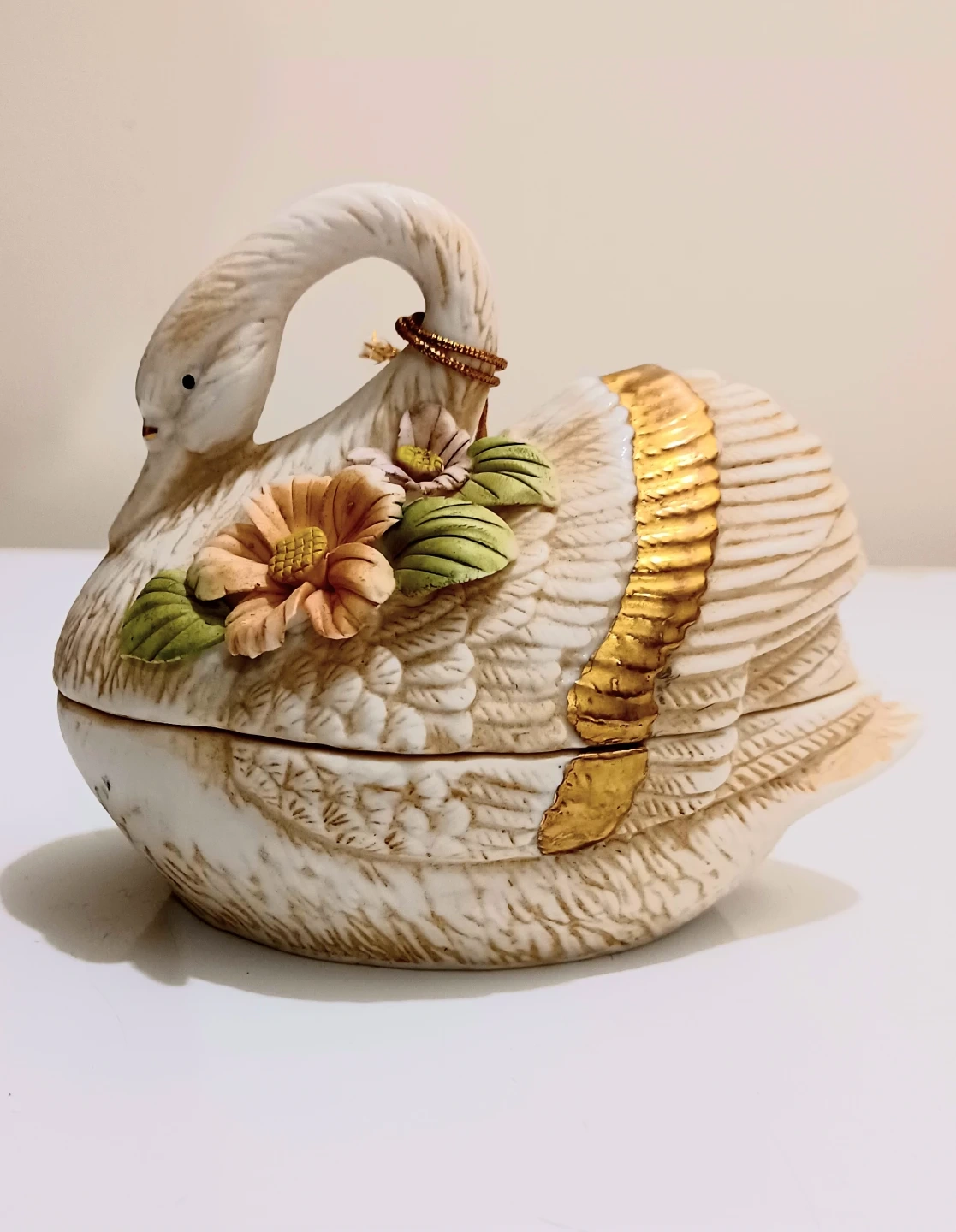This is a lovely Laurenti Swan Trinket Box. It's a decorative piece that can also store small items. As seen in the photos, it is in Excellent condition, with original tags & Stickers