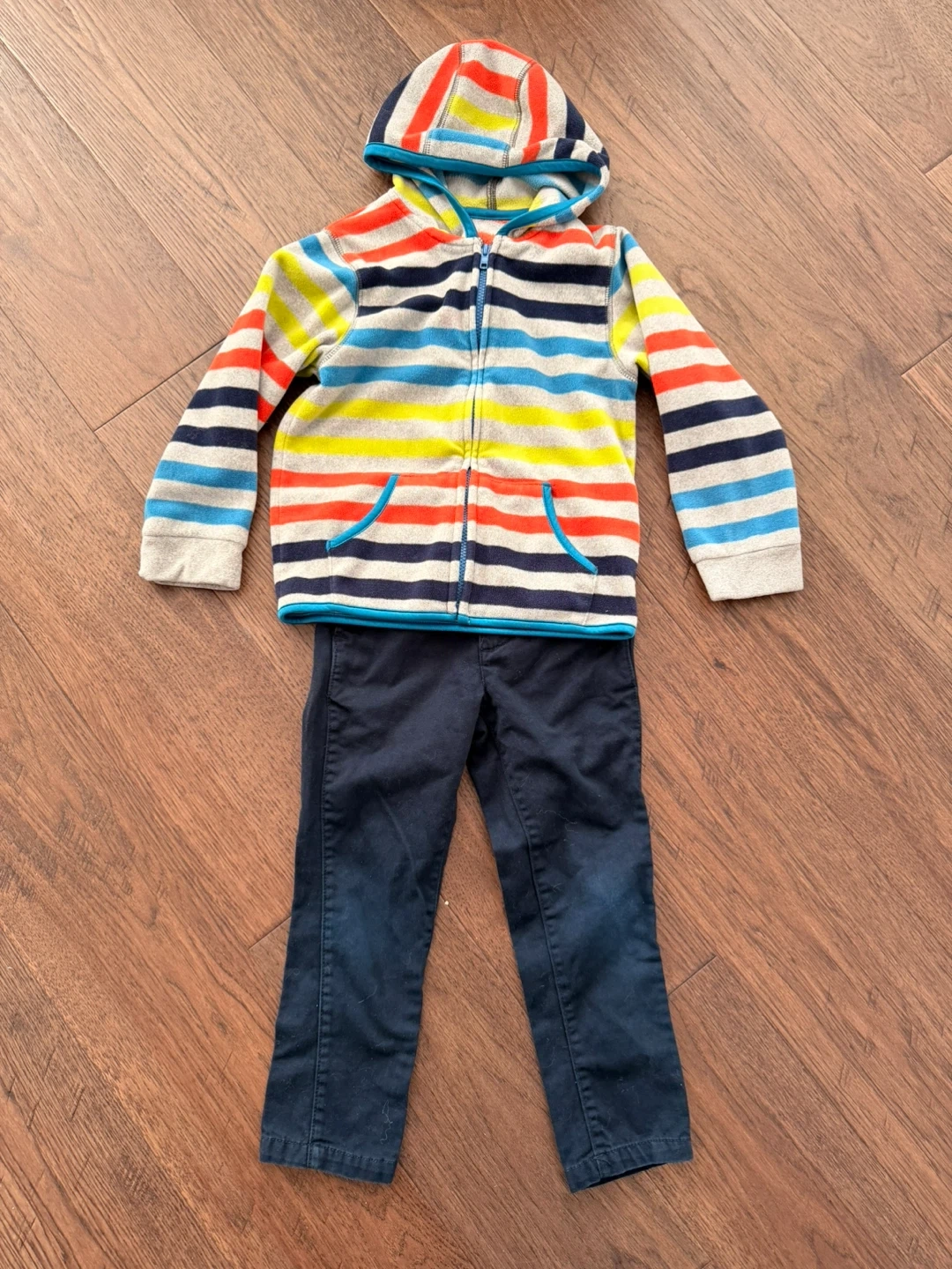 This is a two-piece outfit. It includes a colourful striped fleece zip-up hoodie from Gymboree (size 4T-5T, oversized fit) and navy blue pants from The Children's Place (size 5). The hoodie is one of the softest and most comfortable sweaters from my kiddos closet. Perfect for keeping the little ones warm this winter and great as a light jacket in the spring.