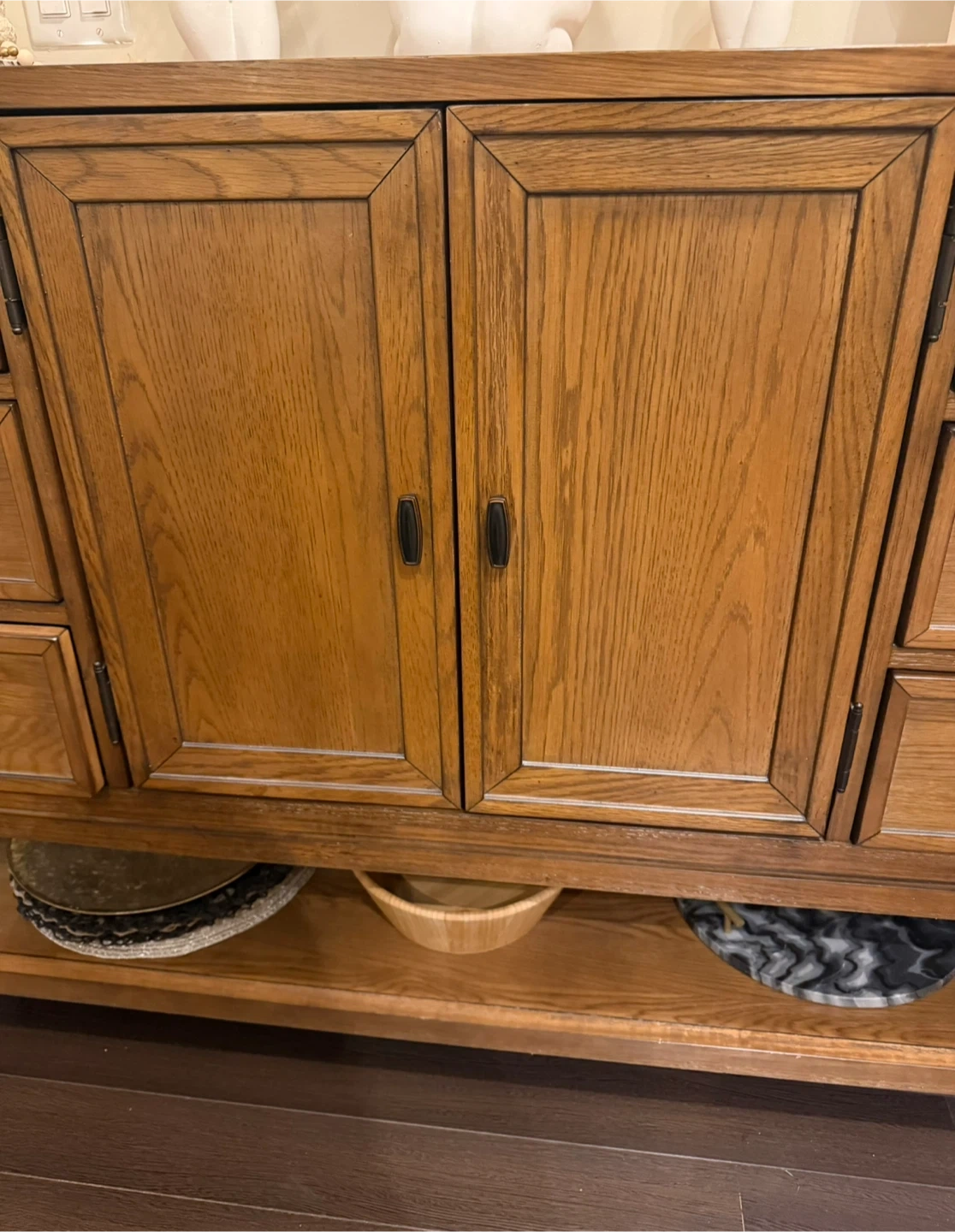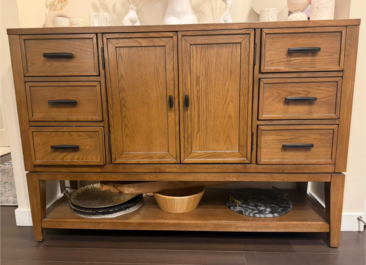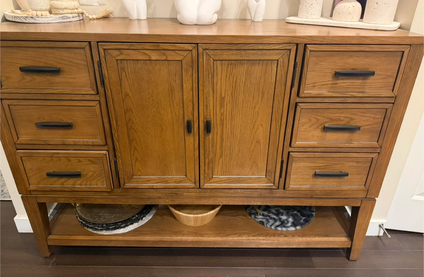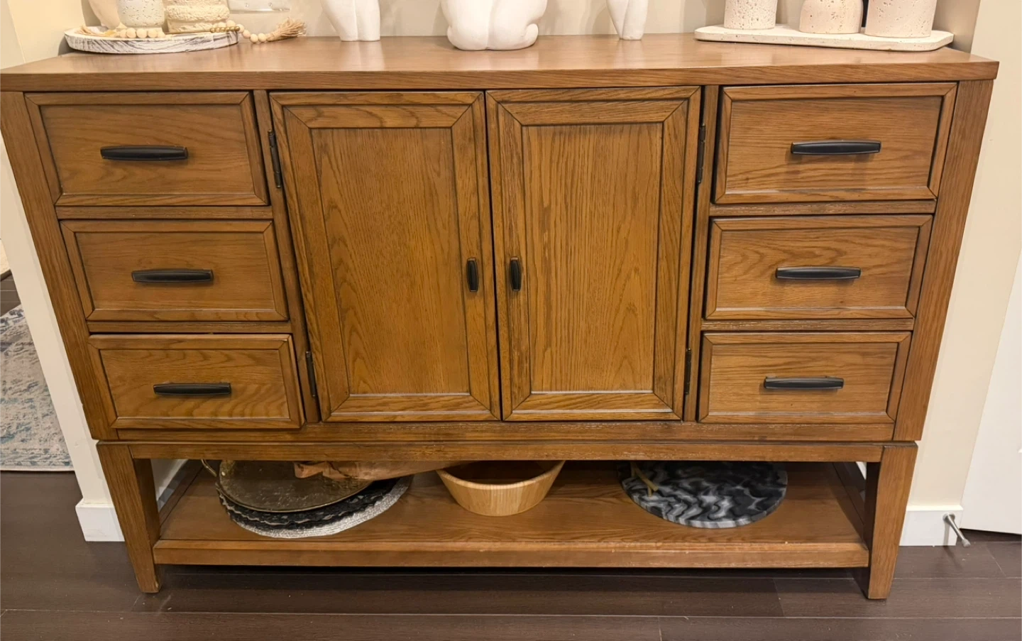 A beautiful wooden sideboard with double doors and multiple drawers for storage. It's made of solid wood with a warm, natural finish. This piece offers ample space for organizing various items. It is 143 cm x 46 cm. It’s brand is Property Brothers.