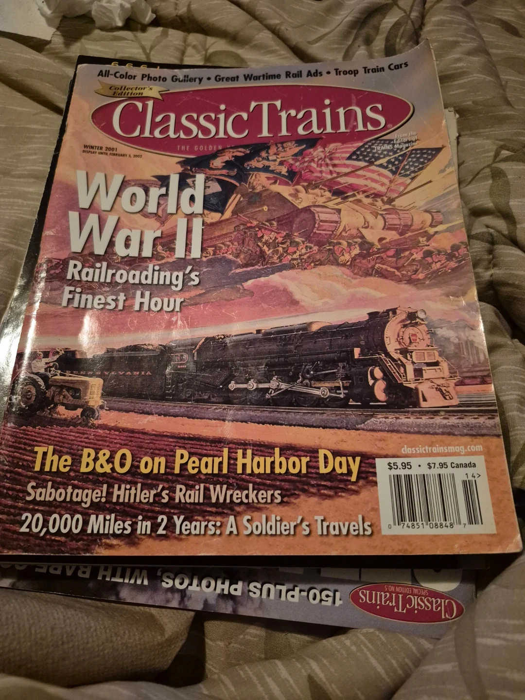 This is the Winter 2001 Collector's Edition of Classic Trains magazine, focusing on "World War II: Railroadings Finest Hour". It features articles on The B&O on Pearl Harbor Day, Sabotage! Hitler's Rail Wreckers, and 20,000 Miles in 2 Years: A Soldier's Travels. This issue was on display until February 5, 2002.