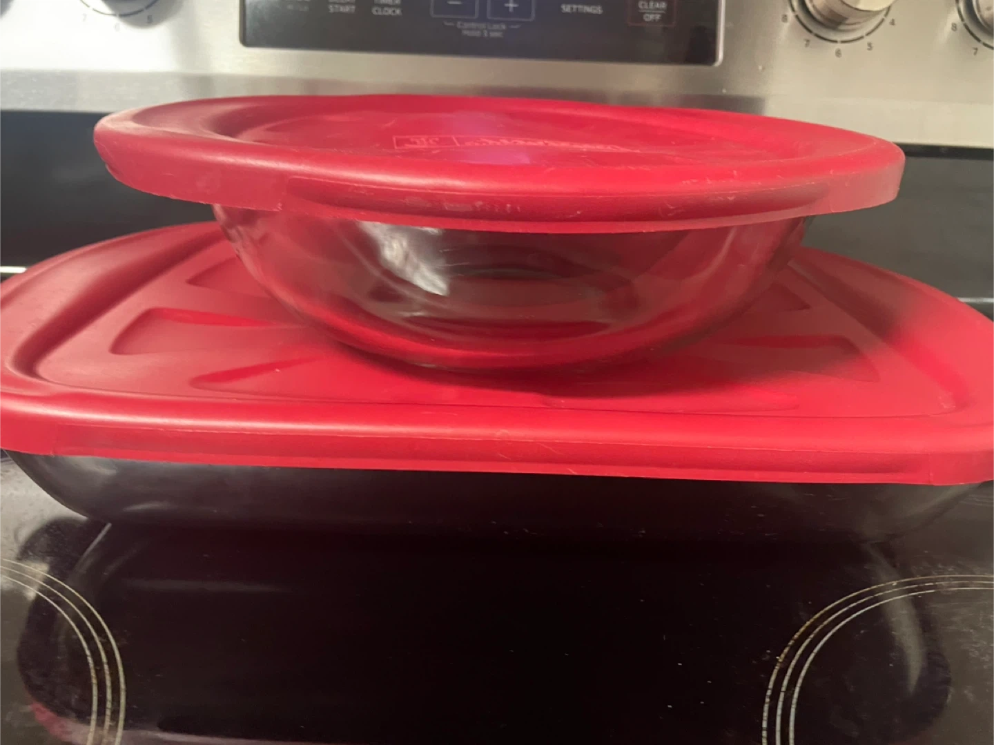 Two Anchor Hocking glass bowls with red plastic lids. Includes one rectangular baking dish and one round mixing bowl. These are handy for storing leftovers or meal prepping!