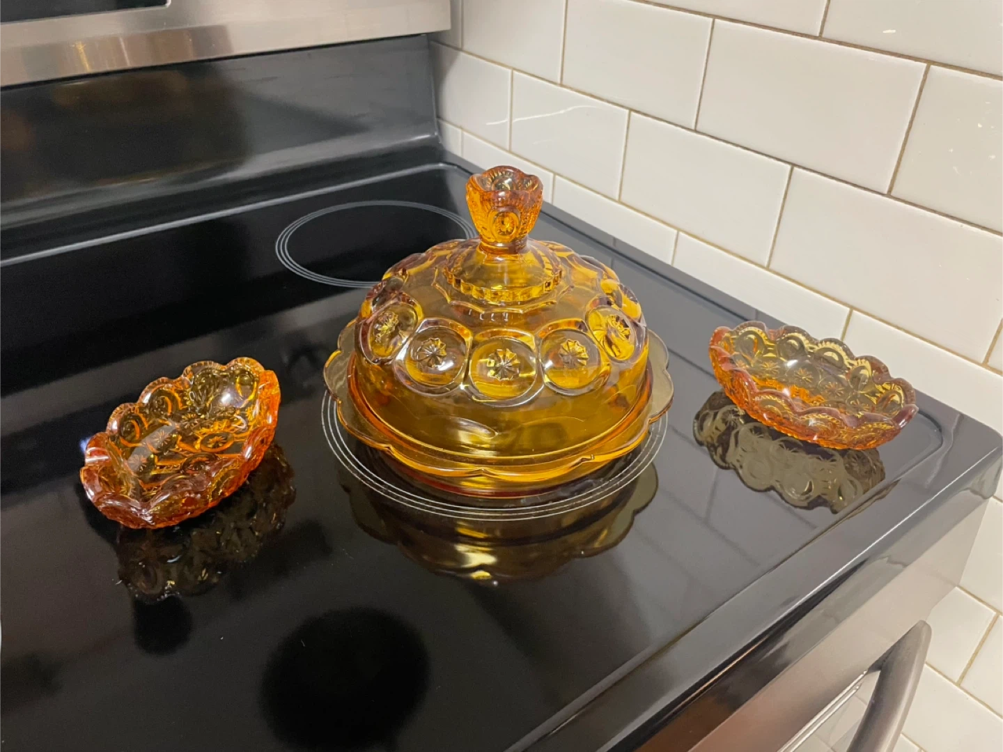 Amber Glass Moon & Stars Pattern Butter Dish with 2 Small Bowls
