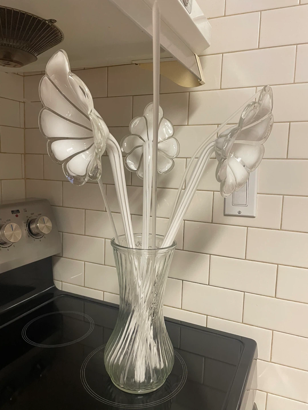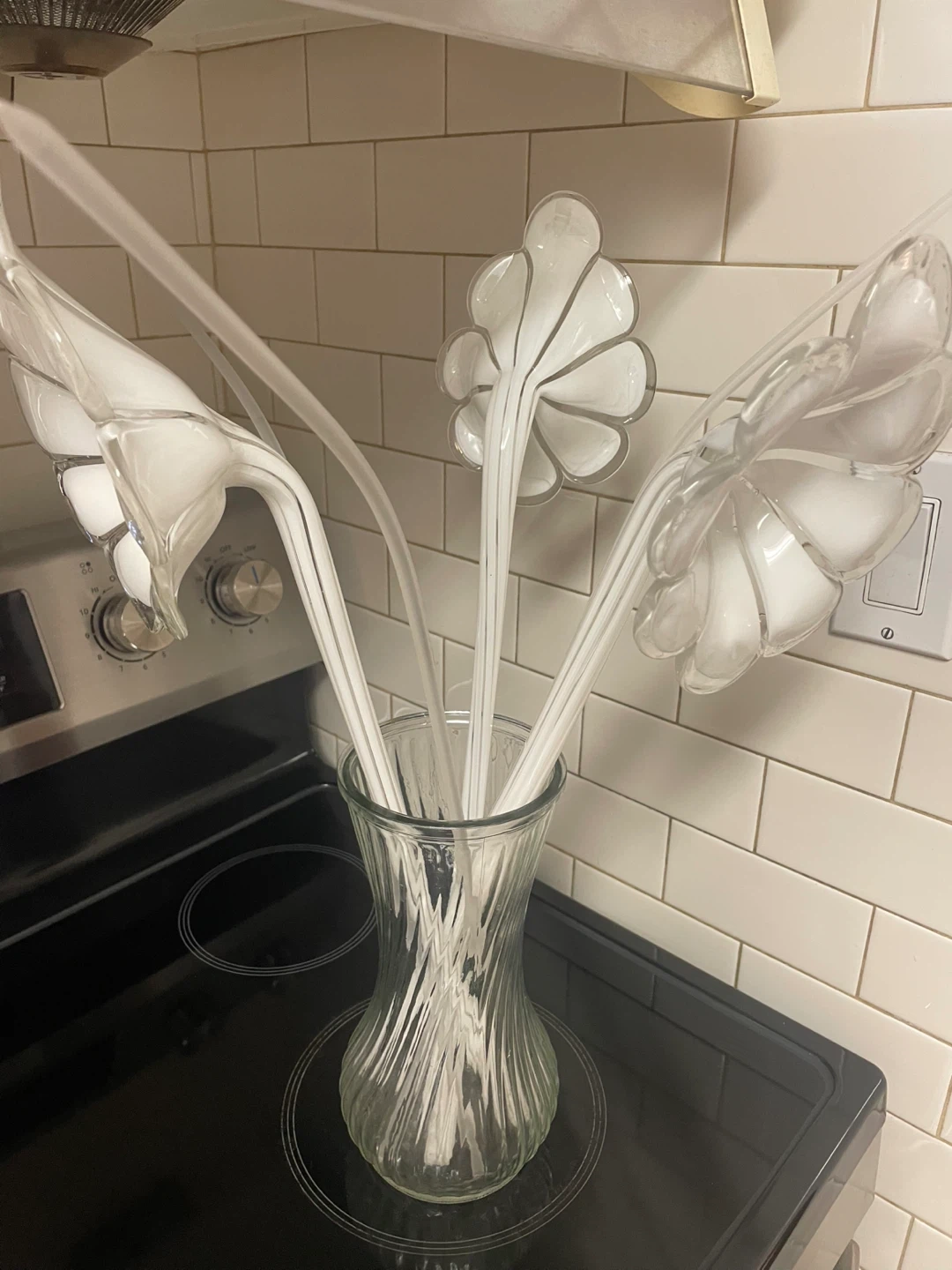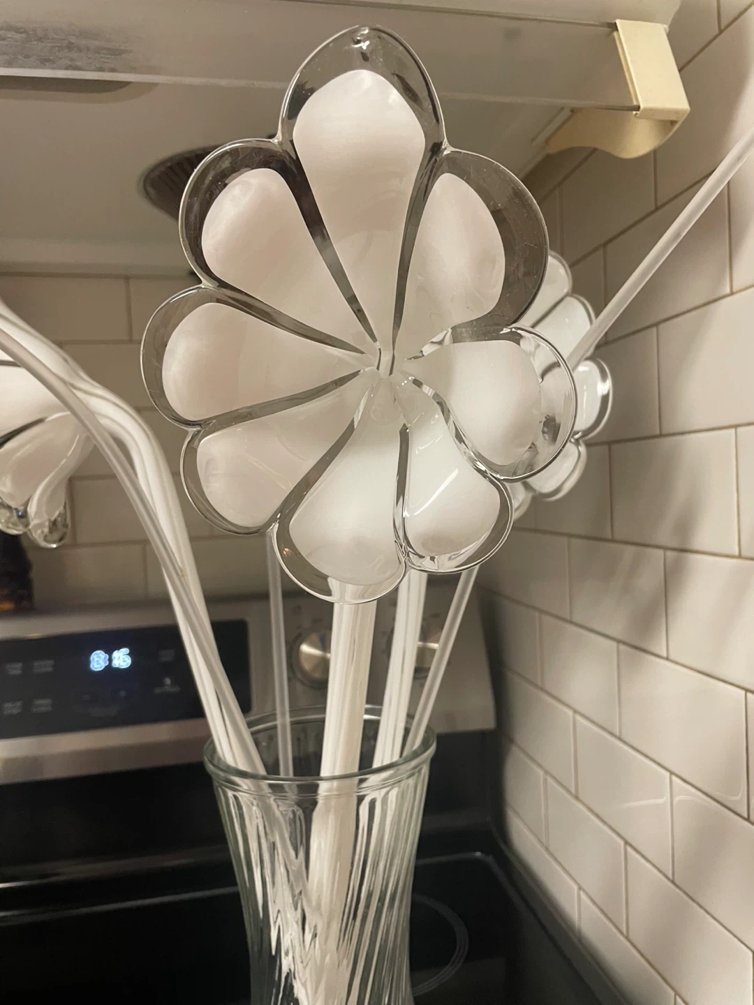 Decorative glass flowers with white accents, arranged in a clear glass vase. Adds a touch of elegance to any space.
