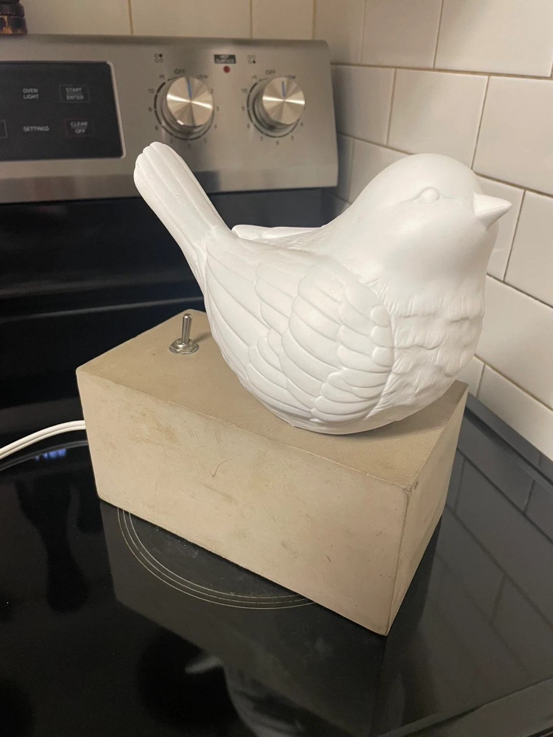 This is a white bird-shaped lamp with a concrete-style base. It has a switch to turn it on and off. Creates a warm glow when lit.