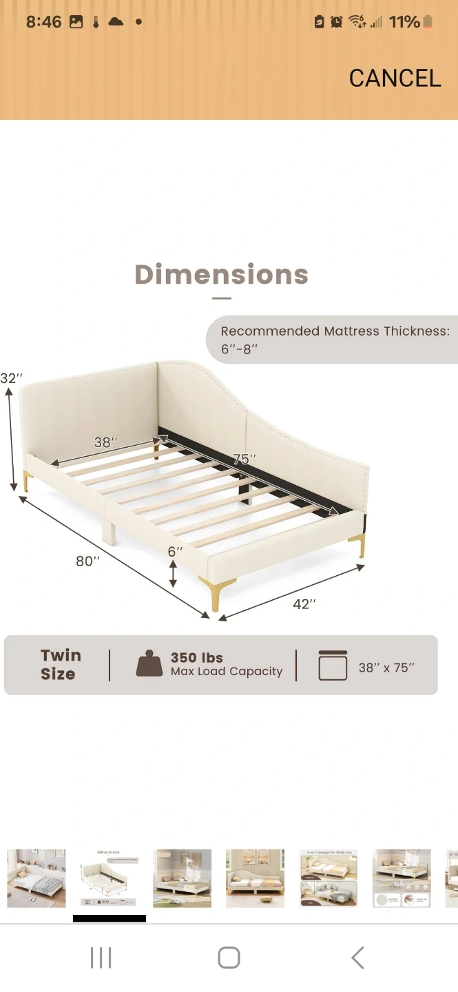 Giantex upholstered daybed with rivet-tufted platform and metal legs. It's a full-size bed with wood slats and includes a headboard. Recommended mattress thickness is 6"-8".