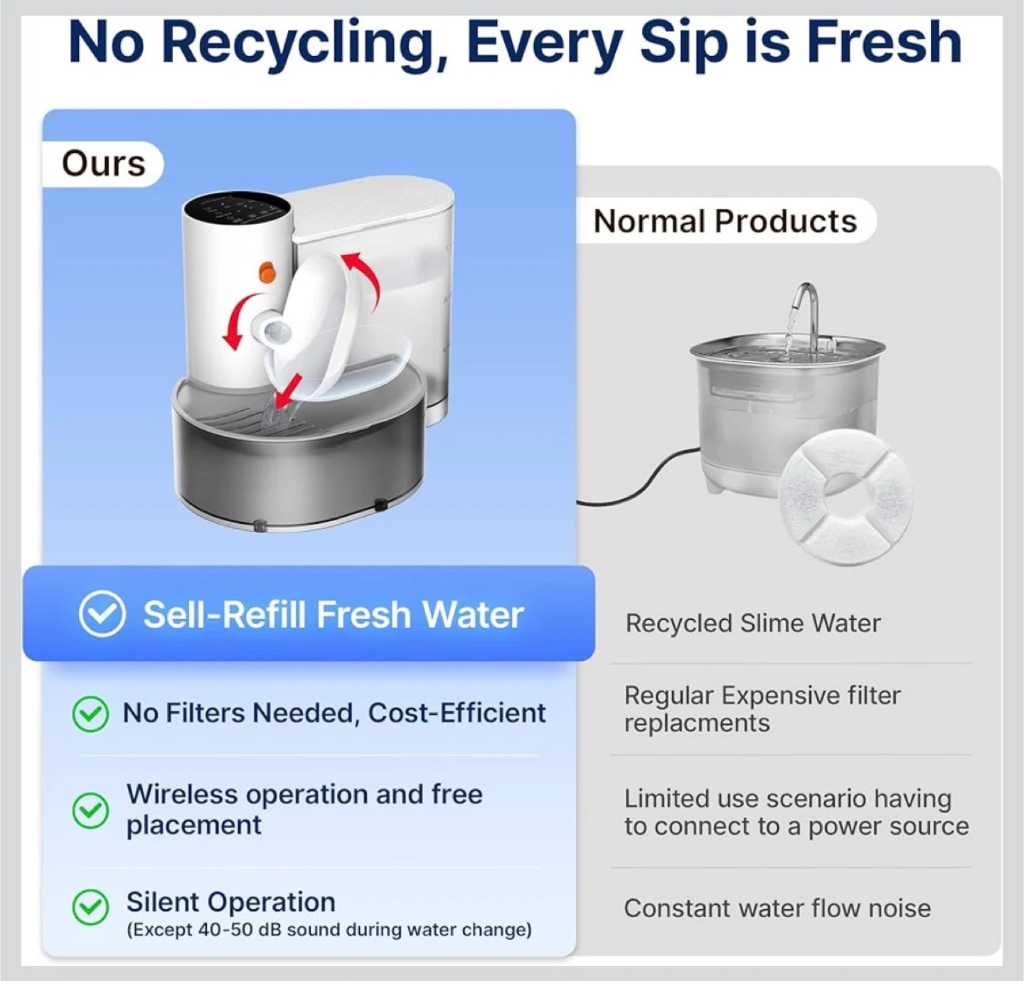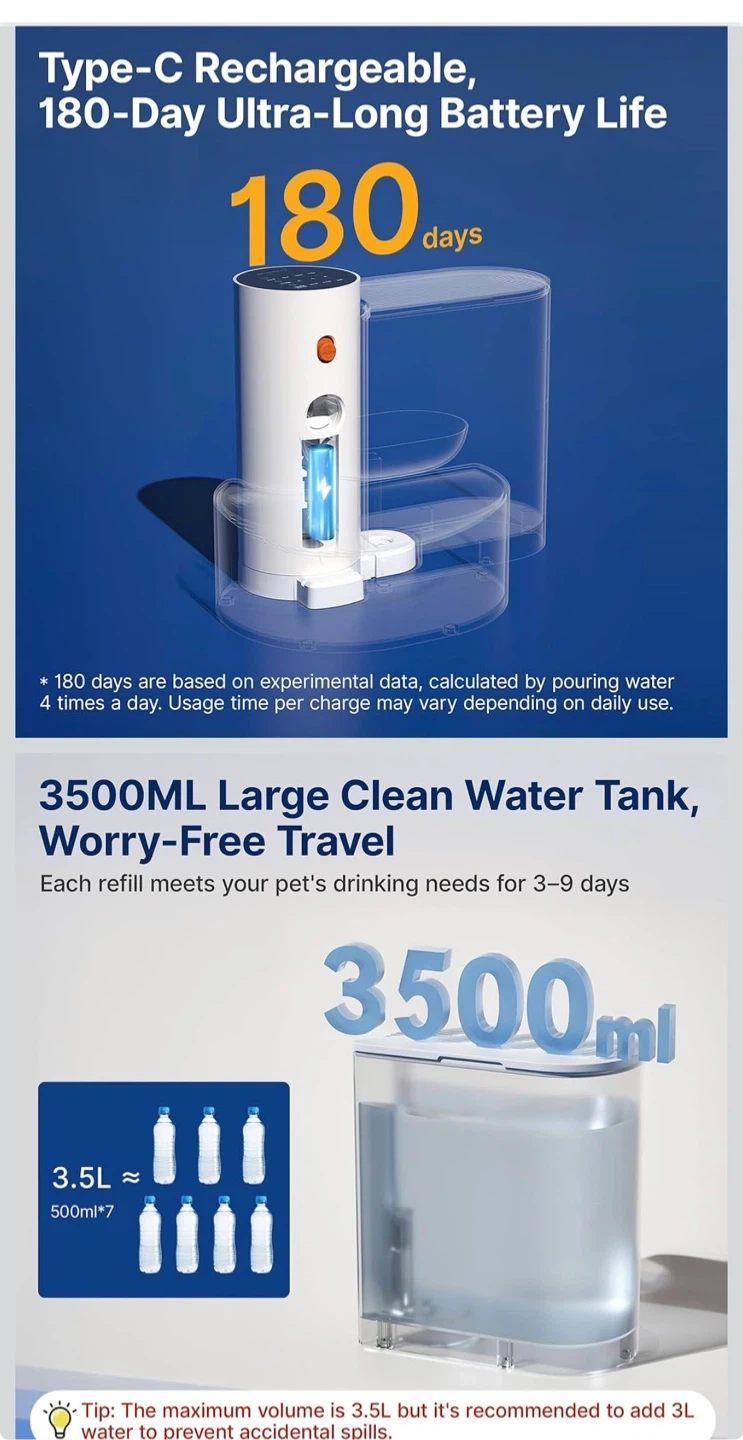 This automatic pet water fountain has a 3.5L capacity, perfect for keeping your pets hydrated. It features a self-refill system with no filters needed and a separate wastewater tank. The unit is USB-C rechargeable with up to 180 days of battery life. Made with Food-Contact Grade ABS.