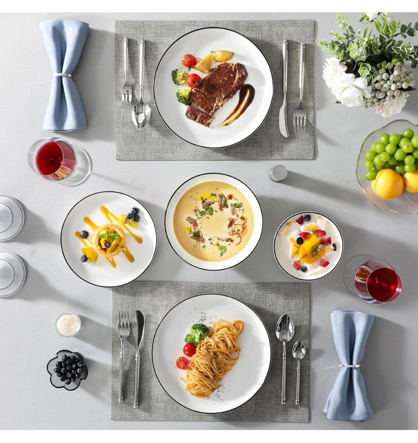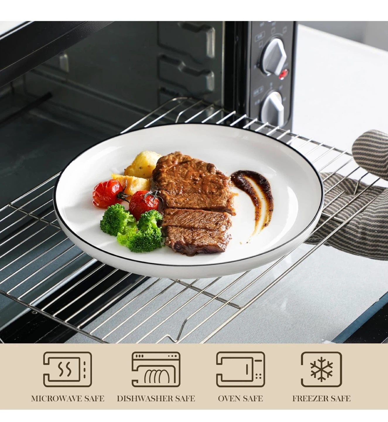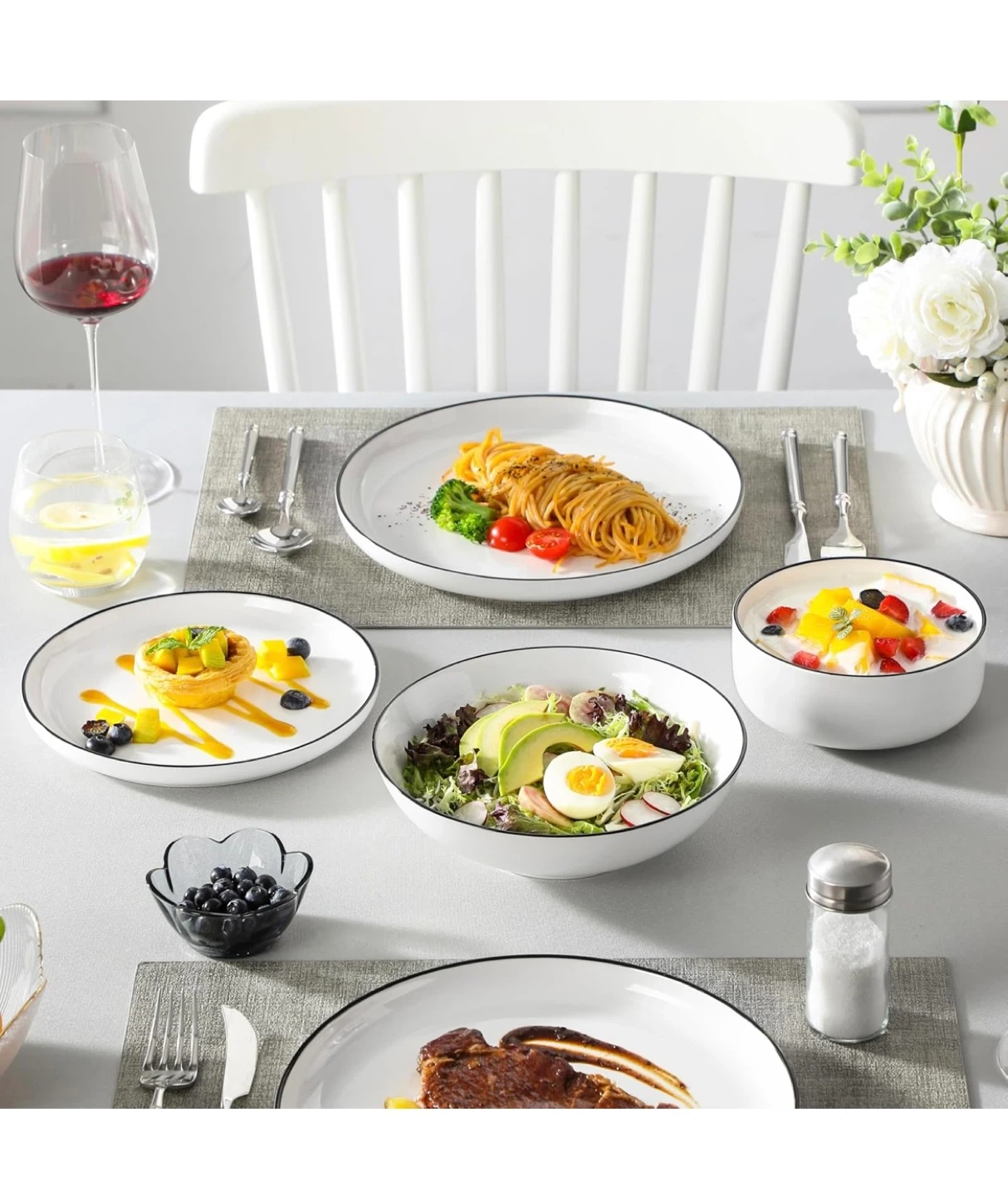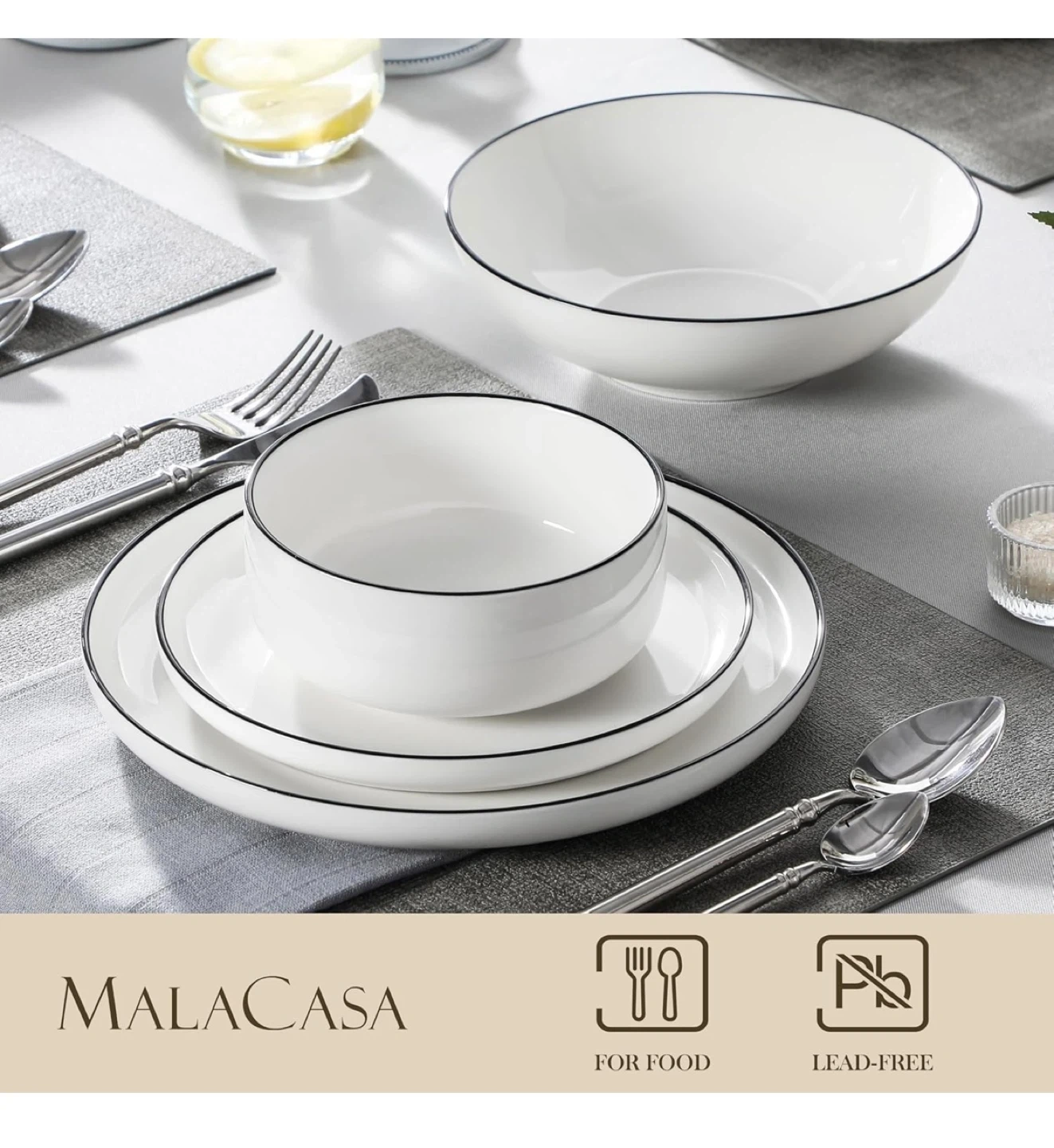 This MALACASA dinnerware set includes white plates and bowls with a classic black rim. They're microwave, dishwasher, oven, and freezer safe. Made of lead-free material for your safety.