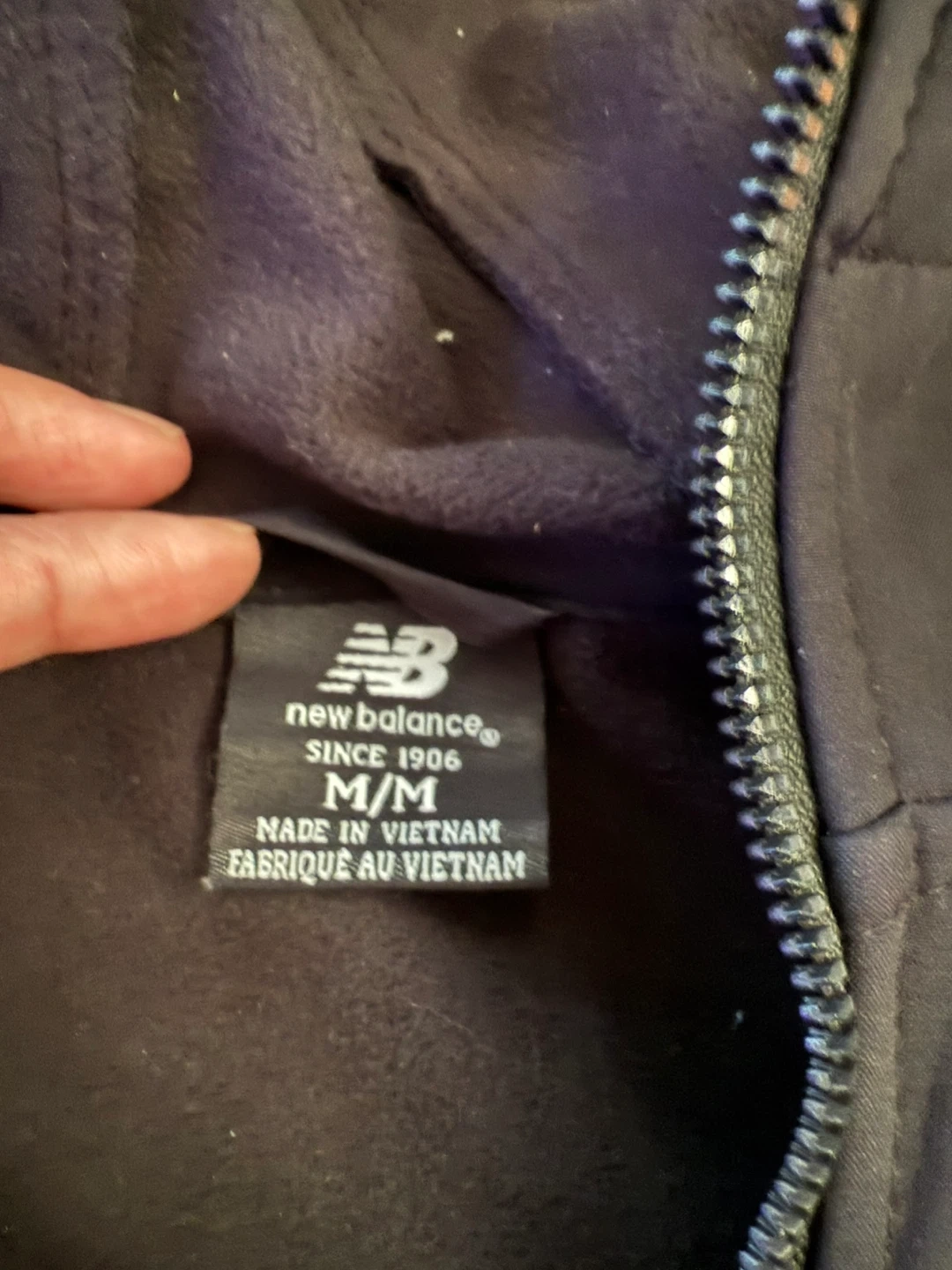 This is a black New Balance hooded jacket. It's size medium (M/M) and made in Vietnam. The jacket features a full zip front and zippered pocketsee.