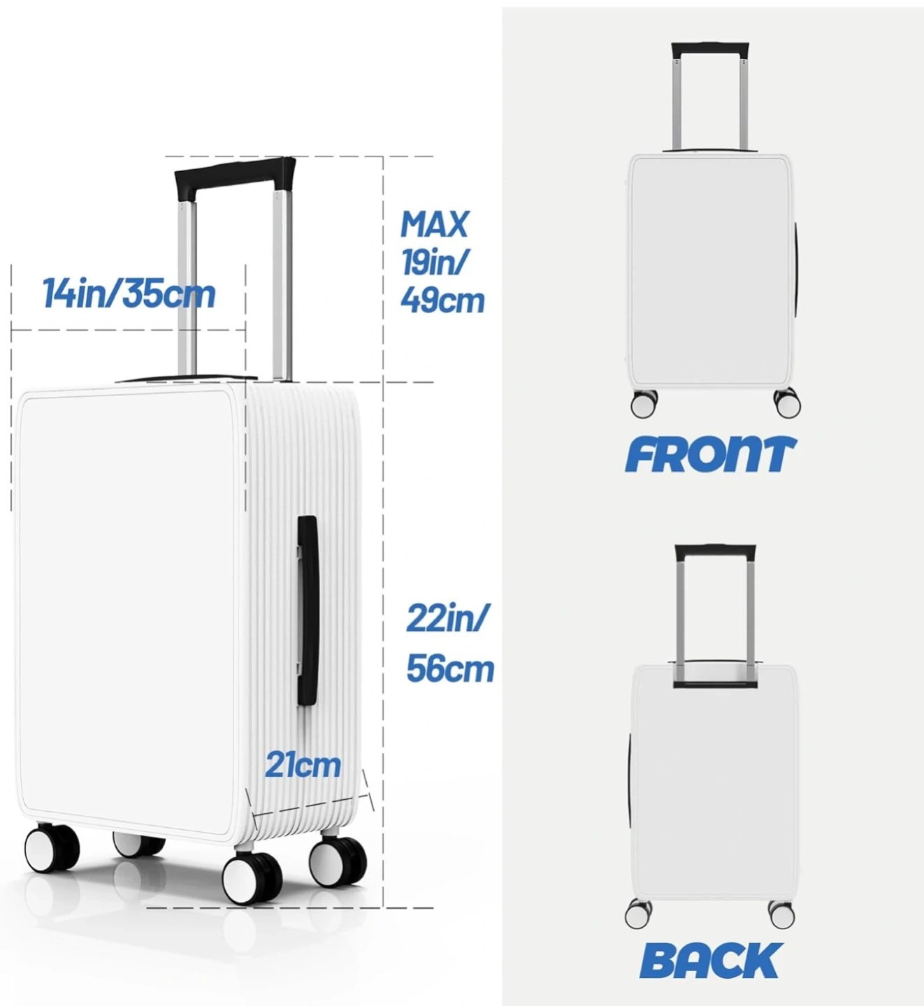 • Convenient Access: Front opening design allows for quick access to essentials like laptops, passports, and wallets without fully opening the luggage.