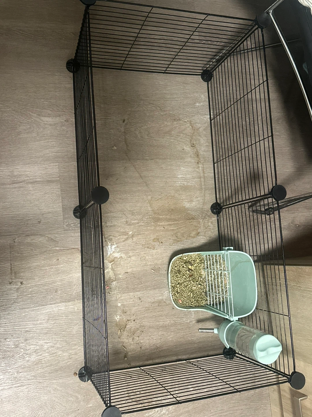 Black wire grid playpen for small pets. Includes a green food bowl with a grate and a water bottle dispenser. Easy to set up and reconfigure. Great for providing pets with a safe space to roam.