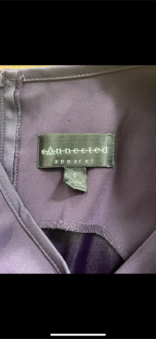 This Connected Apparel dress is a lovely shade of purple. It features a satin panel down the front and has a flattering sheath silhouette. It's a sleeveless design with a boat neckline. Made in Sri Lanka. Size 6.