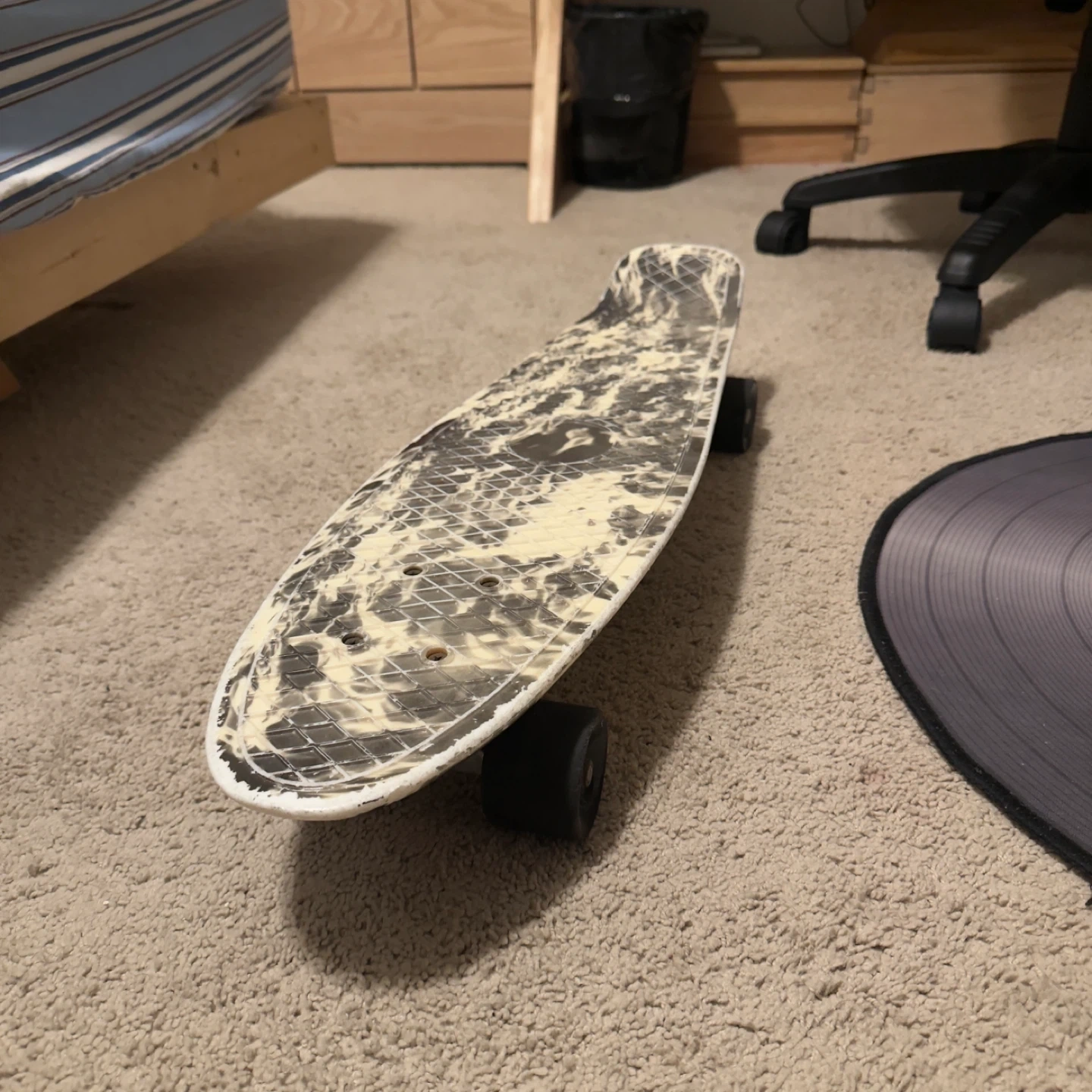 A classic Quarter board style skateboard with a marbled black and cream pattern. It's a compact cruiser, perfect for quick trips. Trucks and wheels are black.