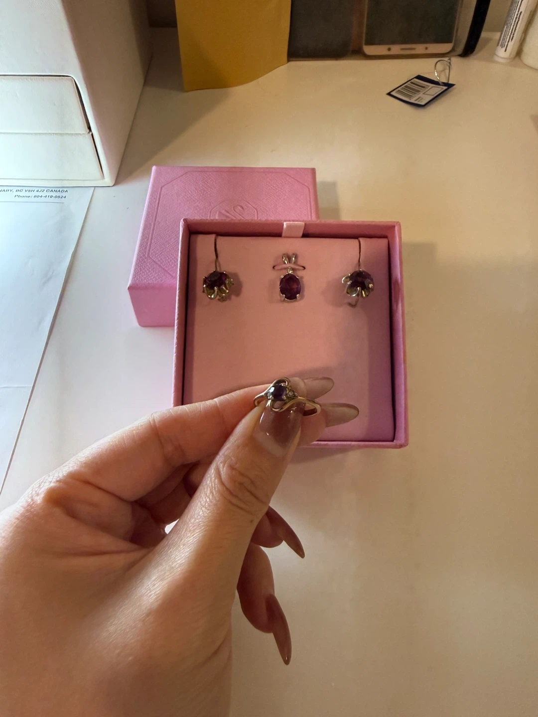 Each piece is adorned with amethyst stones set in a floral design. The set comes in a pretty pink presentation box.