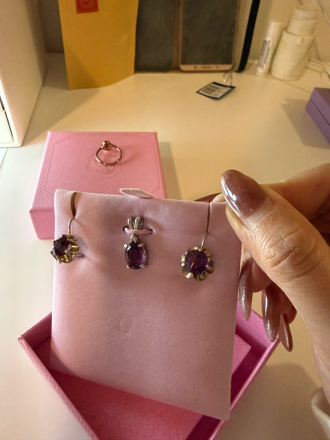This is a three-piece natural amethyst jewelry set featuring a ring, a pendant, and a pair of earrings.