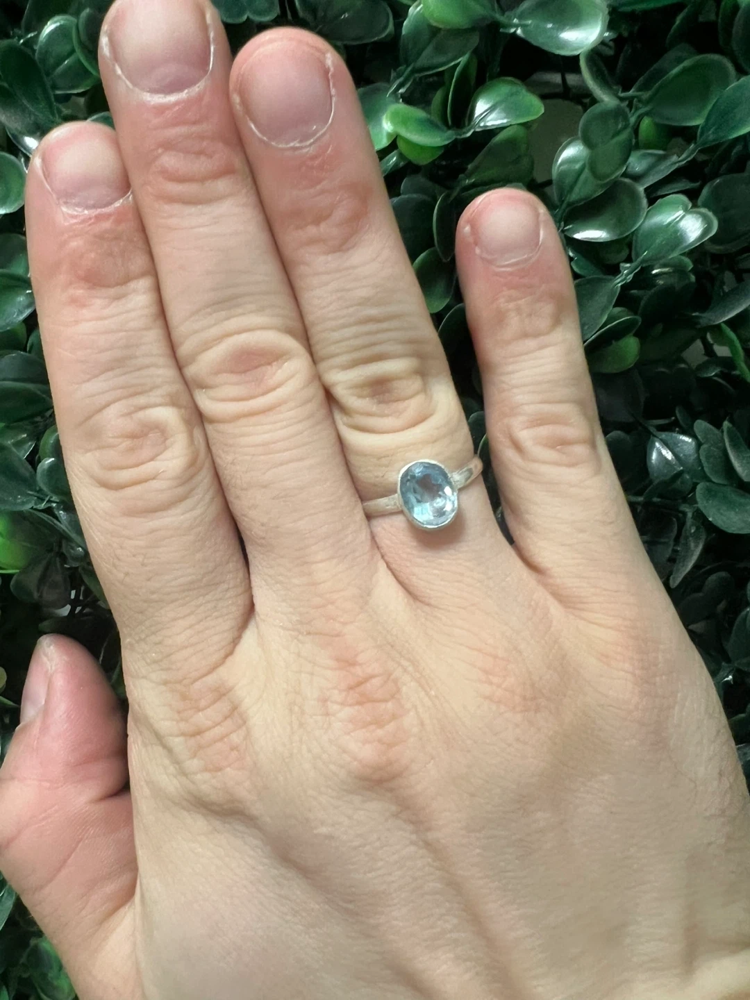 This ring features a stunning oval-cut blue topaz set in a silver band. It's a simple yet elegant piece. The band is made of sterling silver. It's perfect for adding a touch of colour to your everyday look!