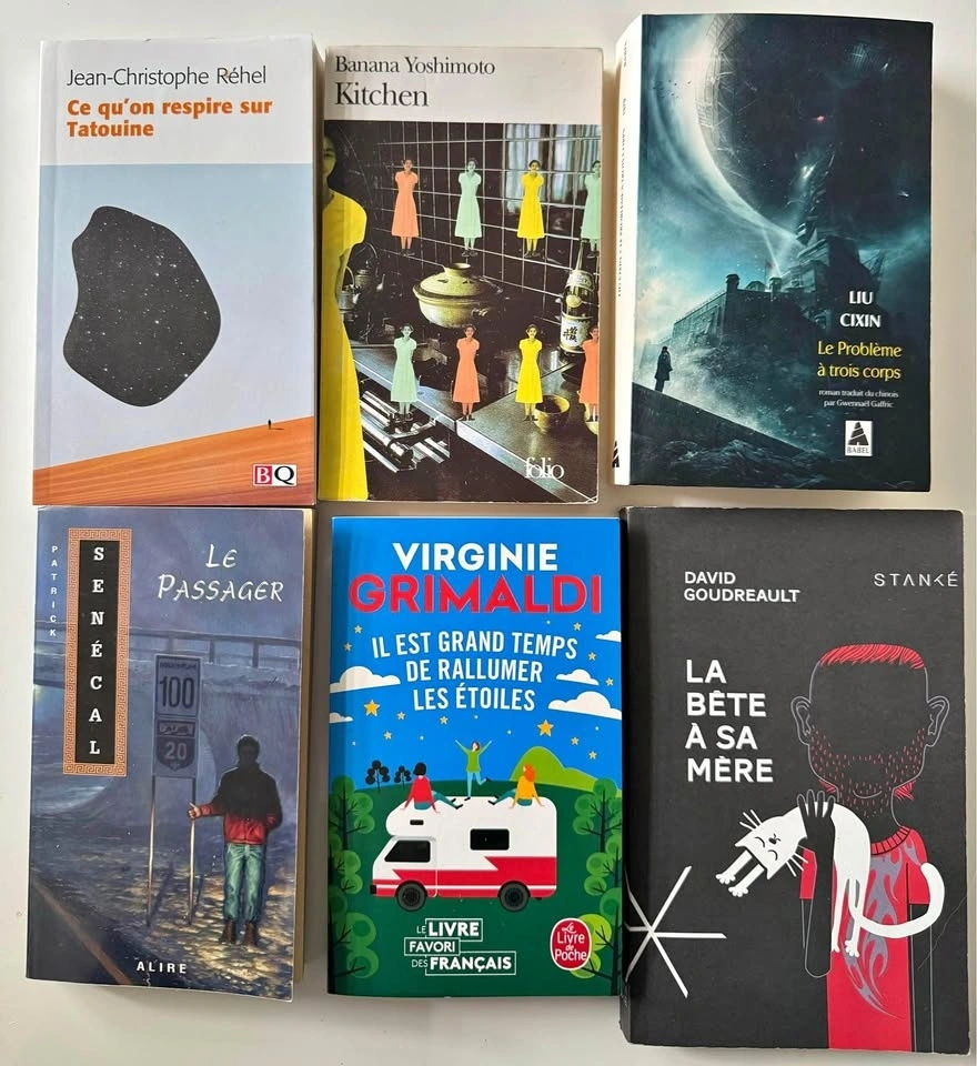 Selling the following French novels: La bête à sa mère by David Goudreault ($20), Kitchen by Banana Yoshimoto ($8), Ce qu’on respire sur tatouine by Jean Christophe Rehel ($10), Le problème à trois corps by Liu Cixin ($20), Il est temps de rallumer les étoiles by Virginie Grimaldi ($15), and Le passager by Patrick Sénécal ($10). All books are in excellent, like-new condition with no scratches and no writing inside. Well-maintained. Highly recommend the novels by David Goudreault and Jean Christophe Rehel!