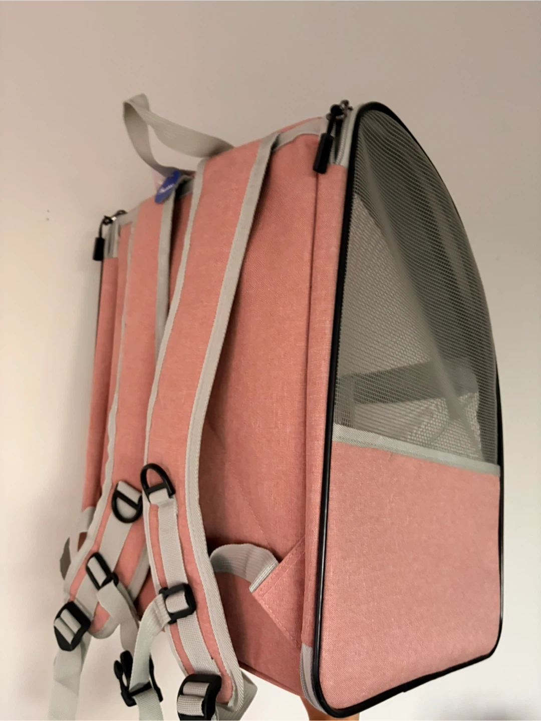 This is a pink and grey pet carrier backpack. It has mesh windows for ventilation. Zippers allow for easy access. It's great for transporting small pets comfortably and safely.