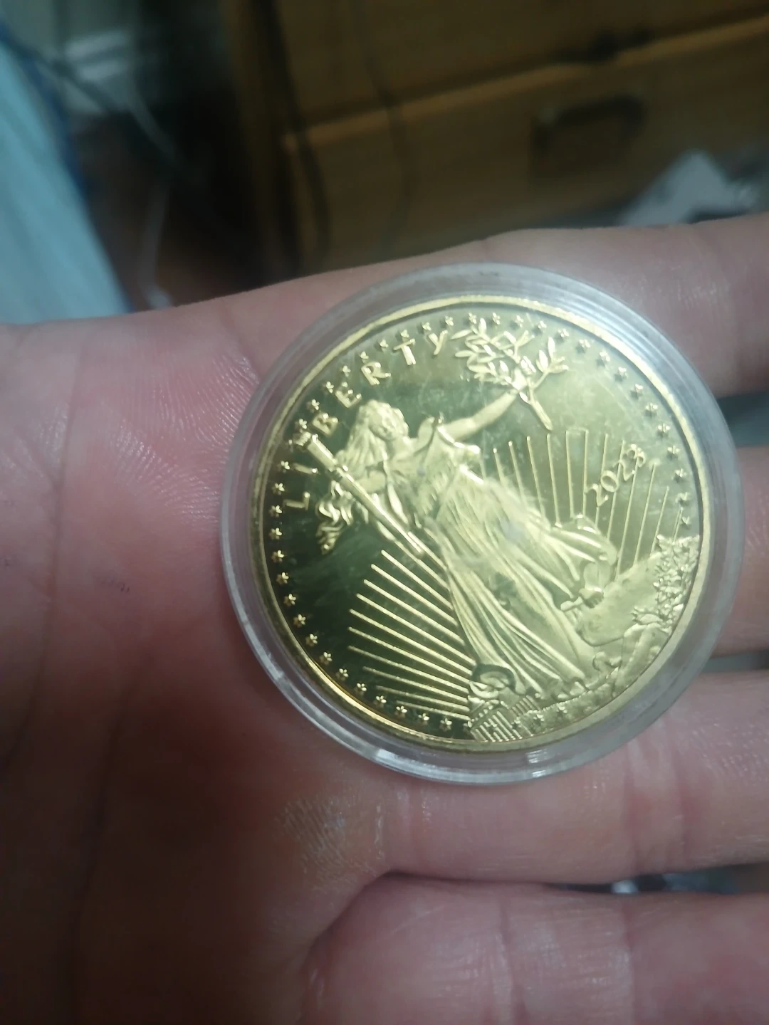 This is a 2023 United States Mint American Eagle one ounce fine gold coin. It features Lady Liberty on the obverse and the heraldic eagle on the reverse. It's a collectible piece.