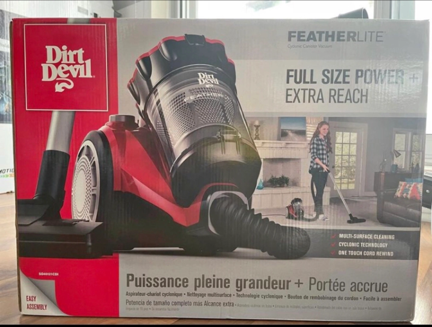 Bagless compact but powerful vacuum cleaner. Works great. Bought from Canadian tire : https://www.canadiantire.ca/en/pdp/dirt-devil-featherlite-cyclonic-lightweight-bagless-canister-vacuum-cleaner-0438498p.0438498.html?rq=Featherlite#srp