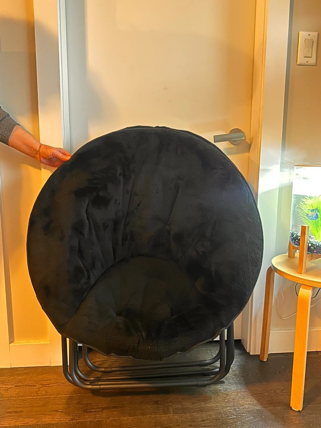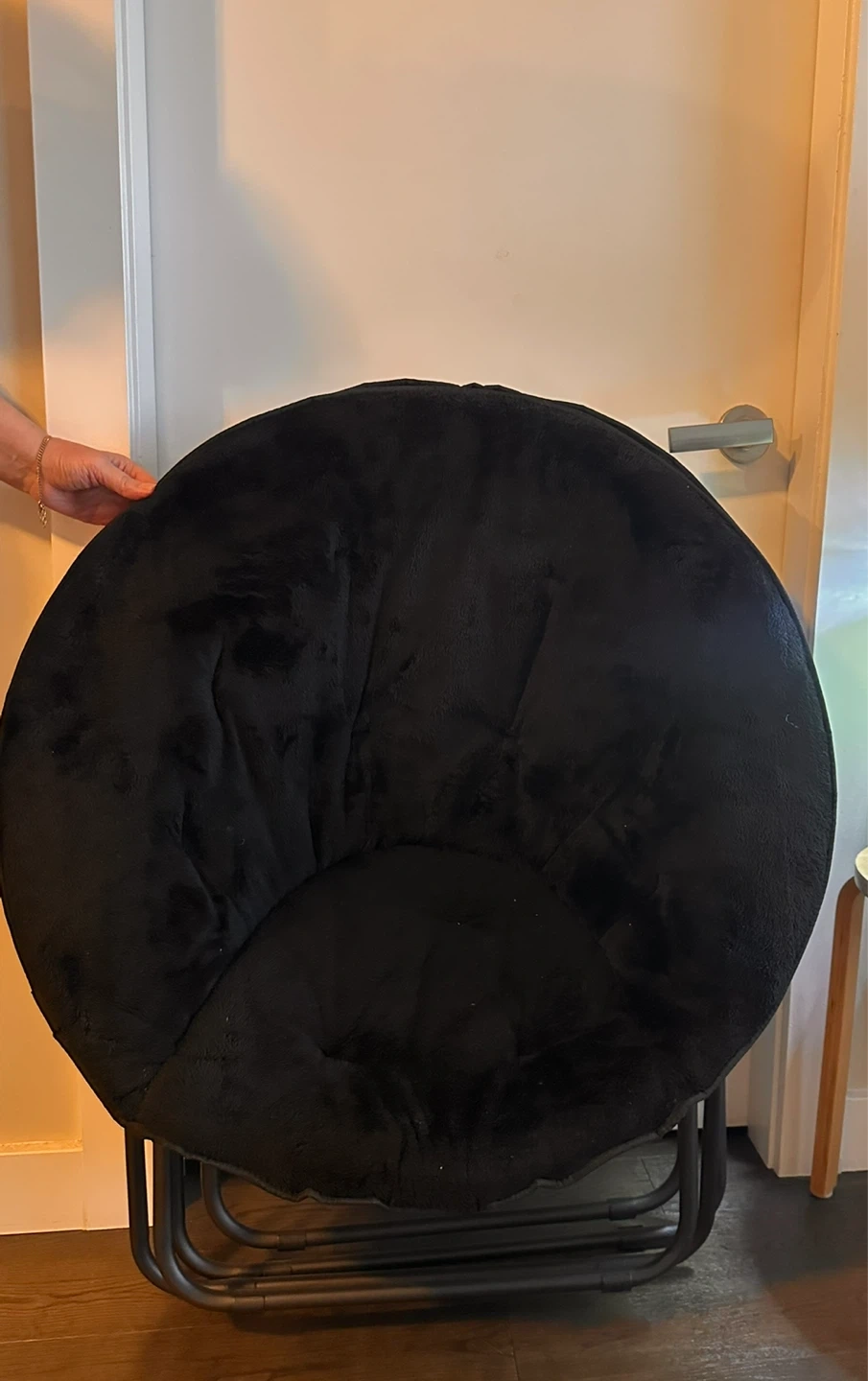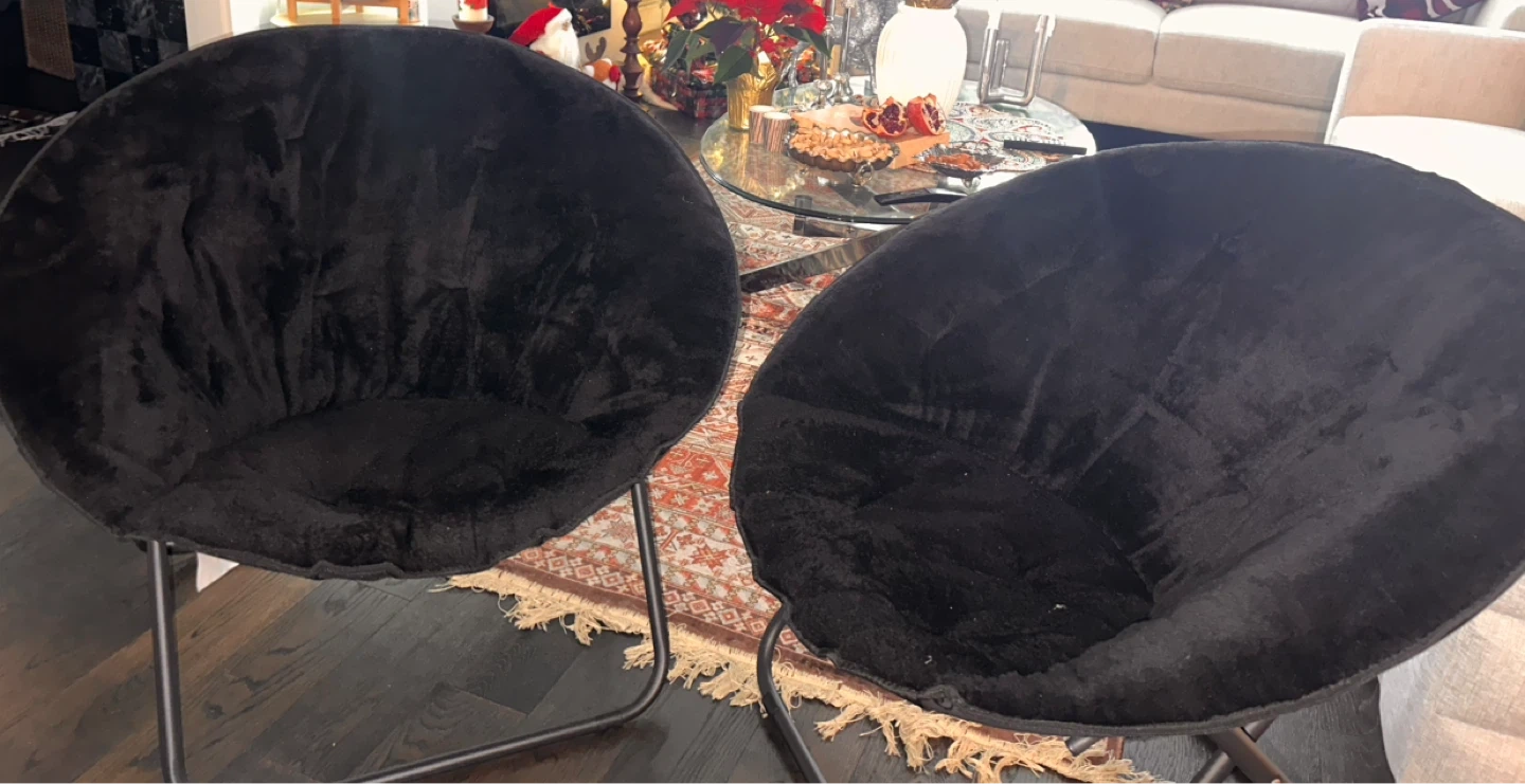 This comfy black faux fur moon chair has a plush seat and a metal frame. It's a fun accent chair that's perfect for a bedroom or living space. The chair's circular design offers a cozy spot to relax. Both all black and brand new from Walmart
