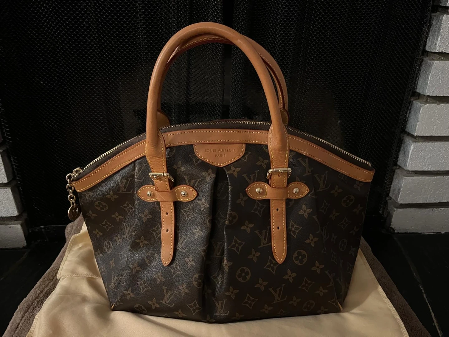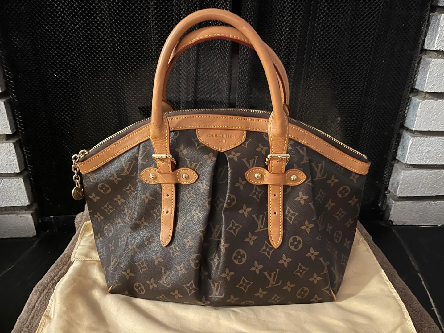 Louis Vuitton Speedy handbag in signature monogram canvas. It features tan leather trim and handles, and a zippered top closure. The interior is lined with brown suede and has multiple pockets.