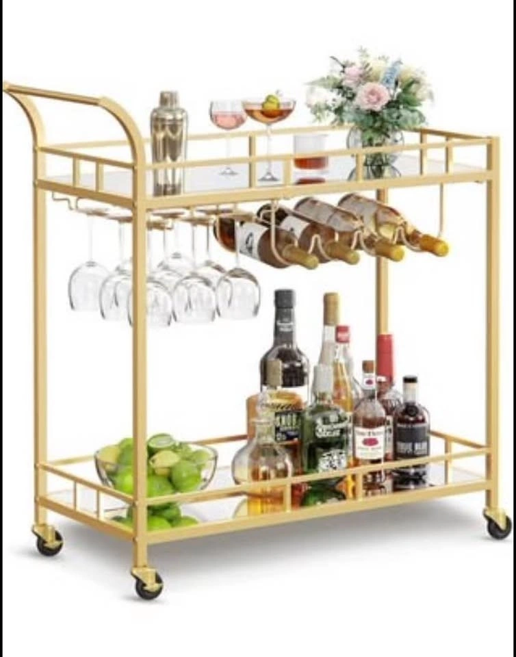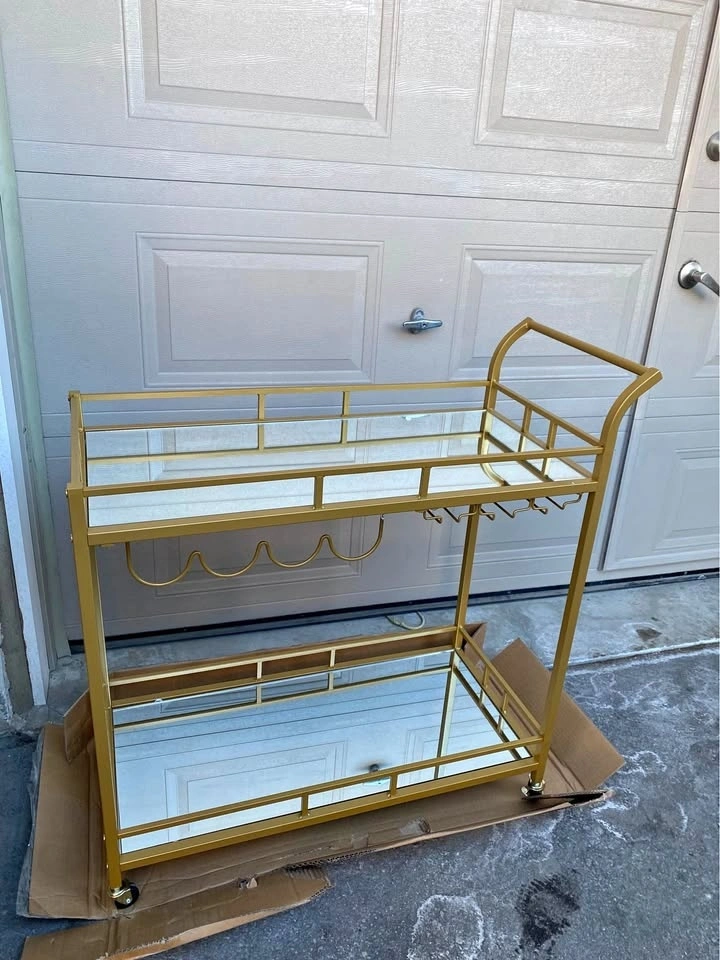 Pick Up: Brock Road & Rex Heath Drive, Pickering. No Holds. VASAGLE Gold Bar Cart with 2 elegant mirrored shelves for bottles, glasses & décor. Built-in wine rack & glass holder. Smooth-rolling wheels for easy serving. Perfect for home bar, kitchen, or dining room. Modern gold finish – stylish & functional.