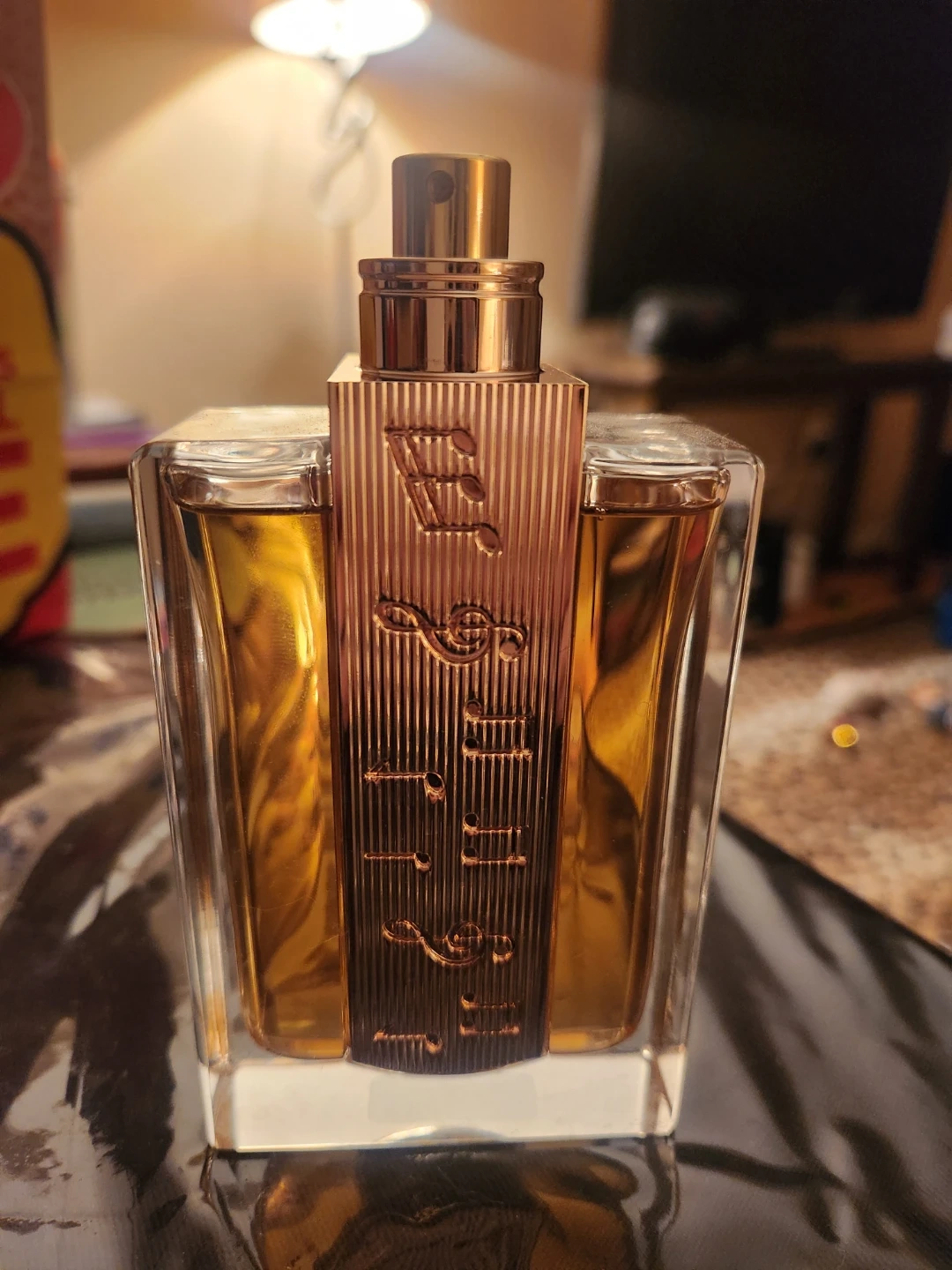 Lattafa Eau de Parfum Natural Spray for external use only. It's made in the U.A.E. with 80% vol. This perfume comes in a distinctive bottle with a musical note design.