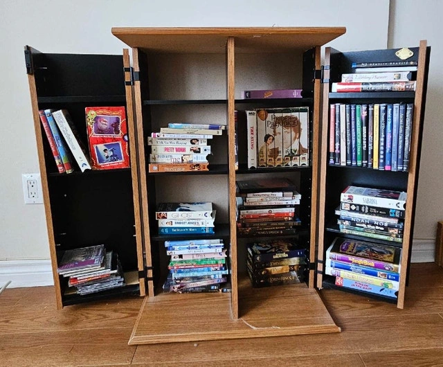 Selling a DVD cabinet in fair condition. Please note the cosmetic damage on the door as shown in the pictures. This media cabinet offers versatile storage with adjustable shelves, perfect for organizing movies or collectibles. Dimensions: