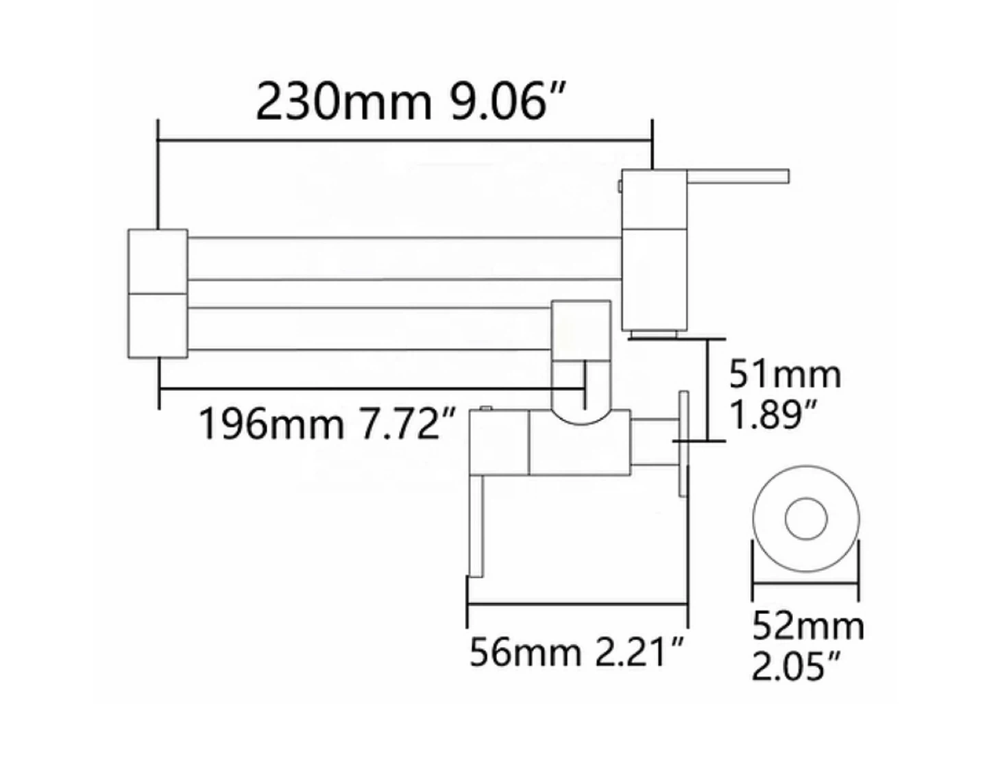 This pot filler faucet is made of chrome-plated brass. It's a dual-handle, wall-mounted design. It extends 230mm (9.06") and has a 196mm (7.72") spout reach. It comes with installation parts.