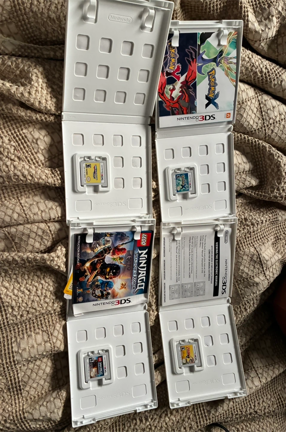 Bundle of four Nintendo 3DS video games. Includes Pokemon X SOLD, Pokemon Y, Lego Ninjago: Shadow of Ronin, and The Legend of Zelda: A Link Between Worlds. All cartridges are for the Nintendo 3DS
