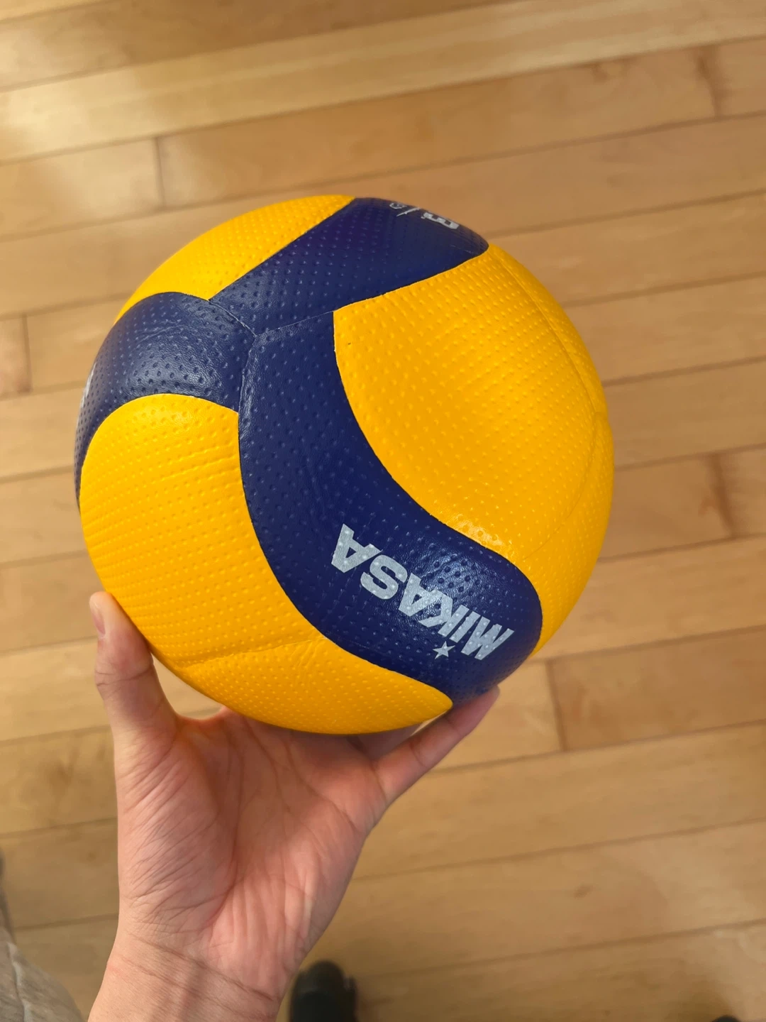 Yellow and blue Mikasa V200W volleyball. It's made in Thailand and designed for indoor play. Inflate to 0.1-0.15kgf/cm² or 1.5-2.2 PSI.