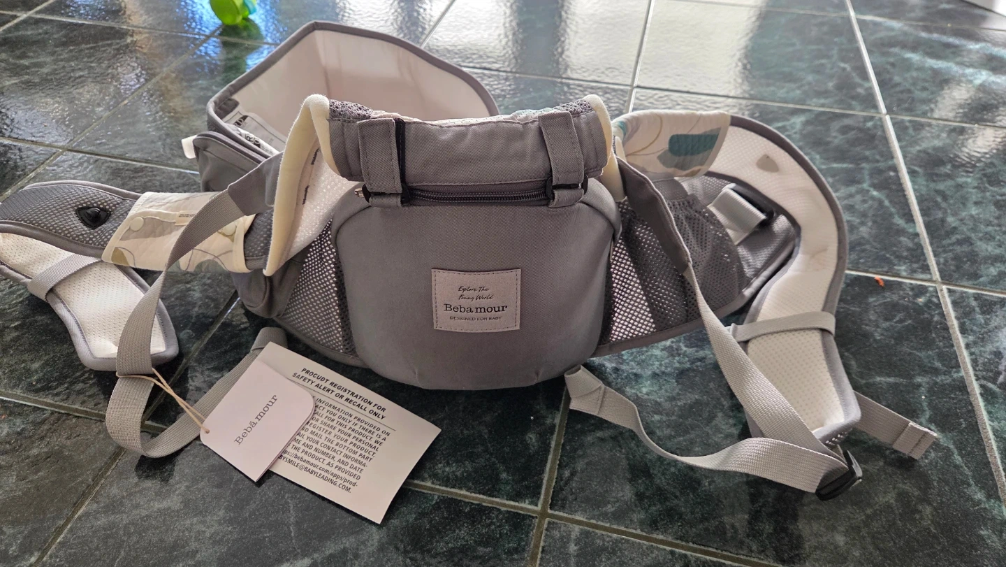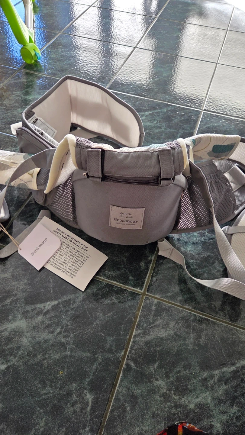This is a brand new Bébamour baby carrier, designed for comfort and convenience. It's made from a soft, grey fabric with mesh accents for breathability.