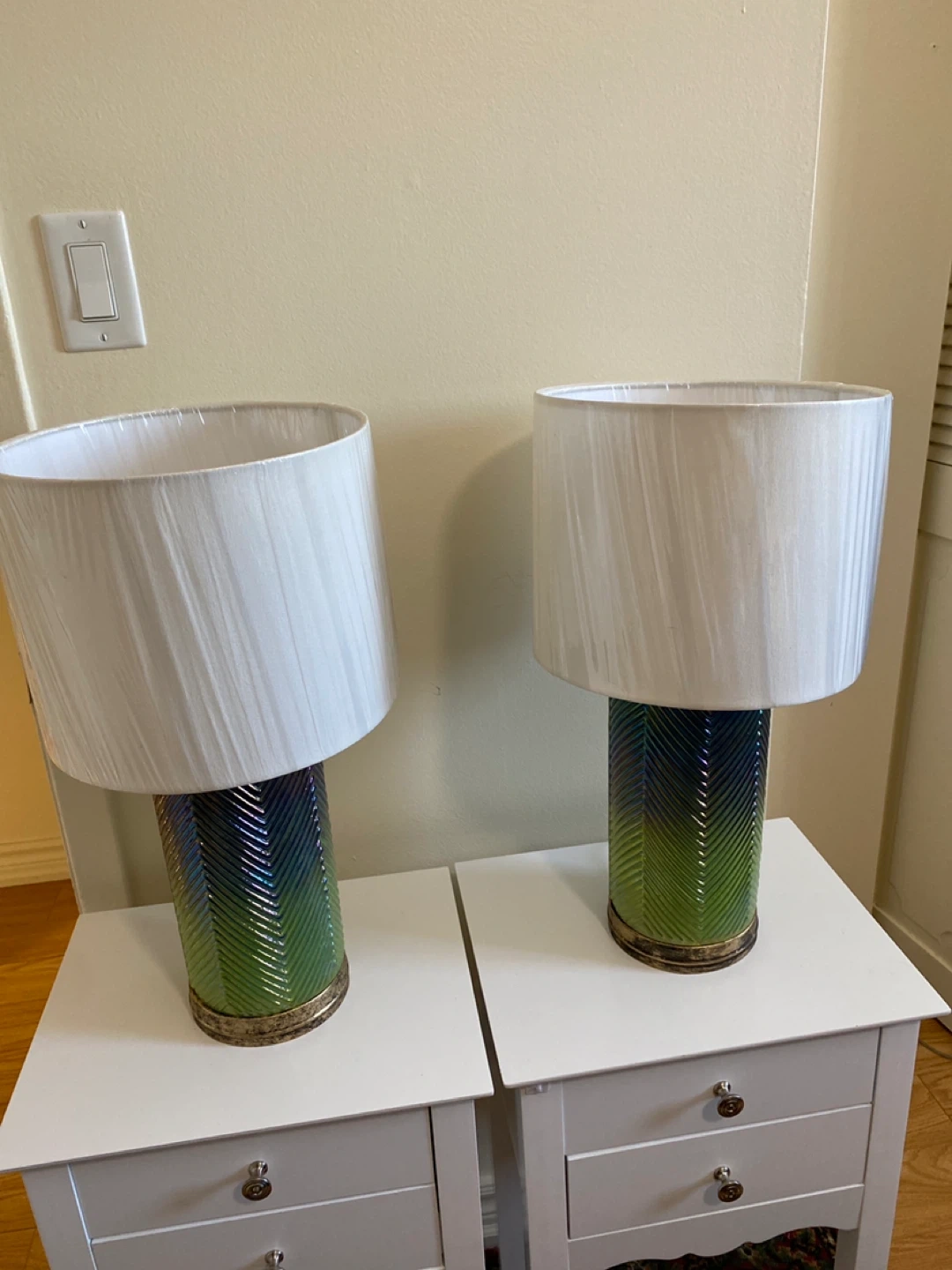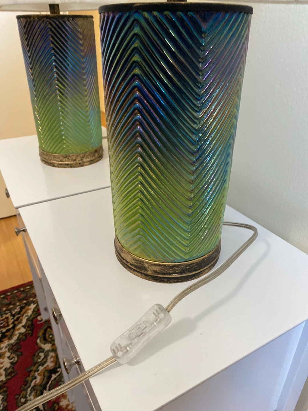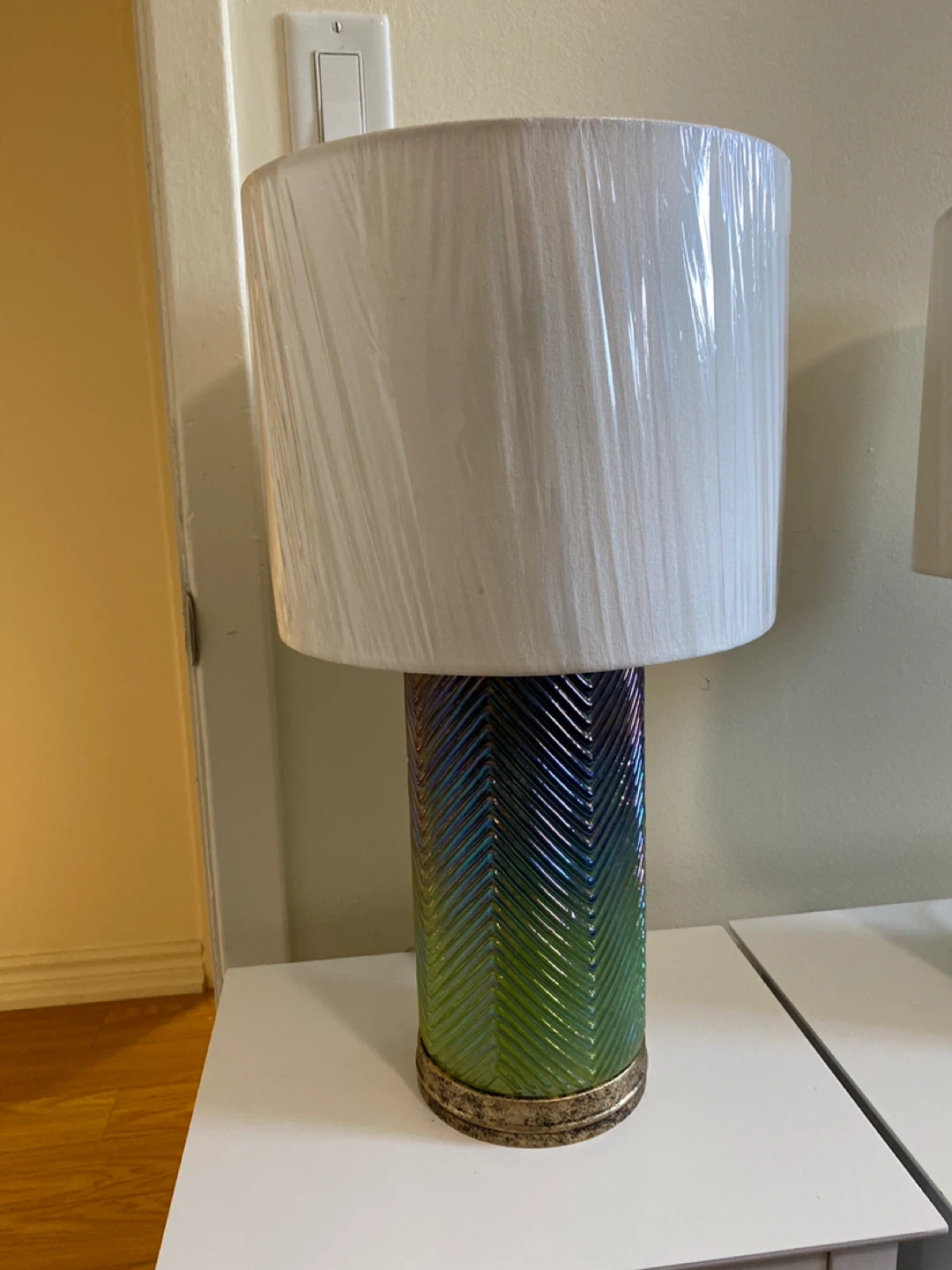 This pair of table lamps features a unique iridescent chevron pattern in green and blue. Used in staging a house. The plastic is still over the white shades.The textured cylindrical bases have a decorative gold-toned trim. Each lamp comes with a white fabric lampshade. Perfect for adding a stylish touch to any room!