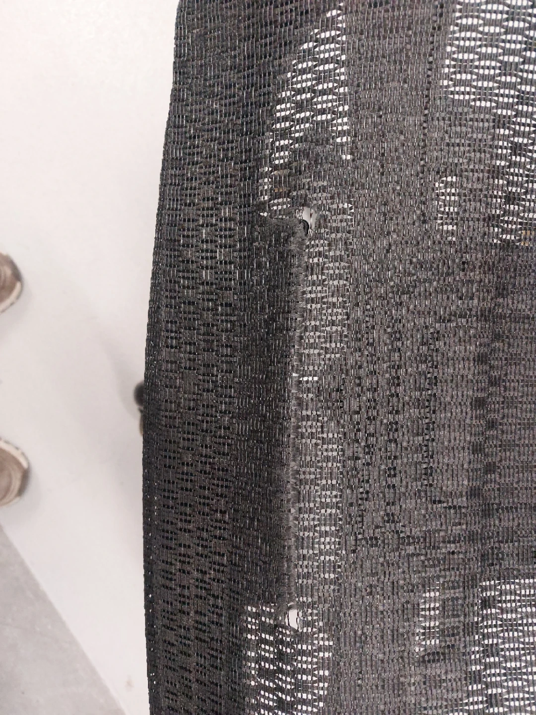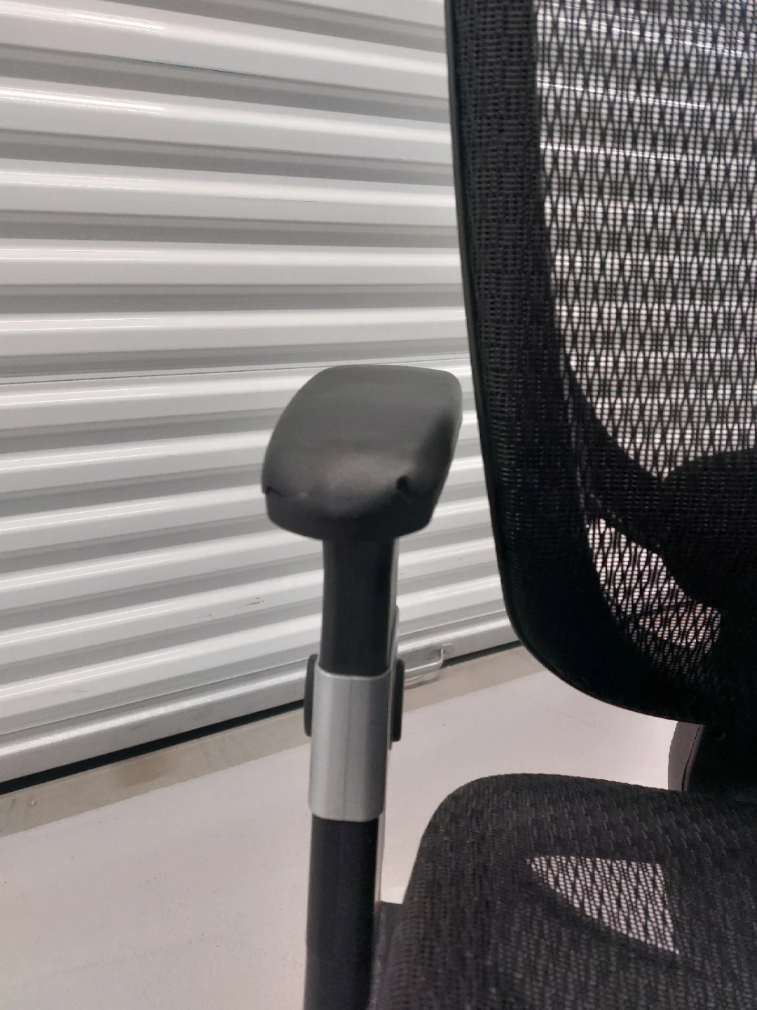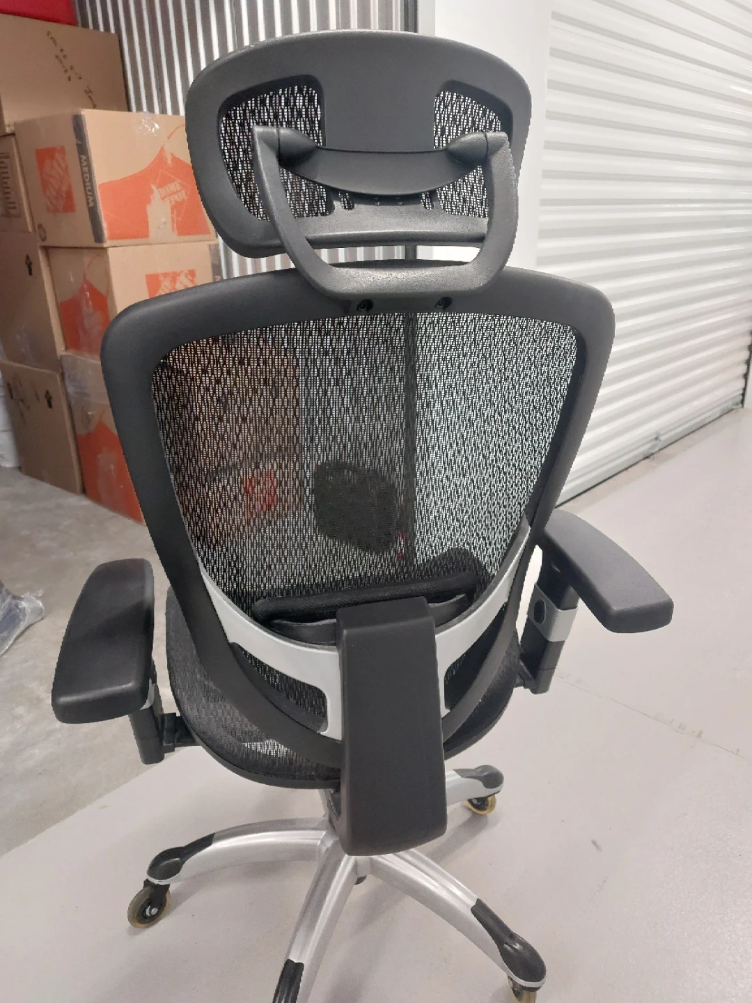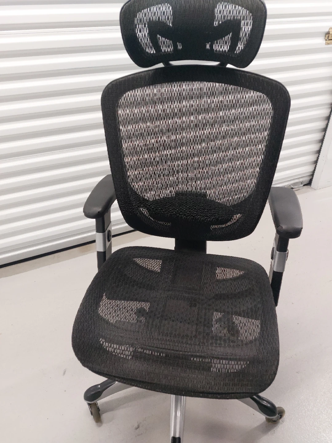 This black mesh office chair offers good back support. It has adjustable armrests and a headrest for added comfort. The mesh material allows for breathability during long work sessions.it has some wear and tare but not much still works great