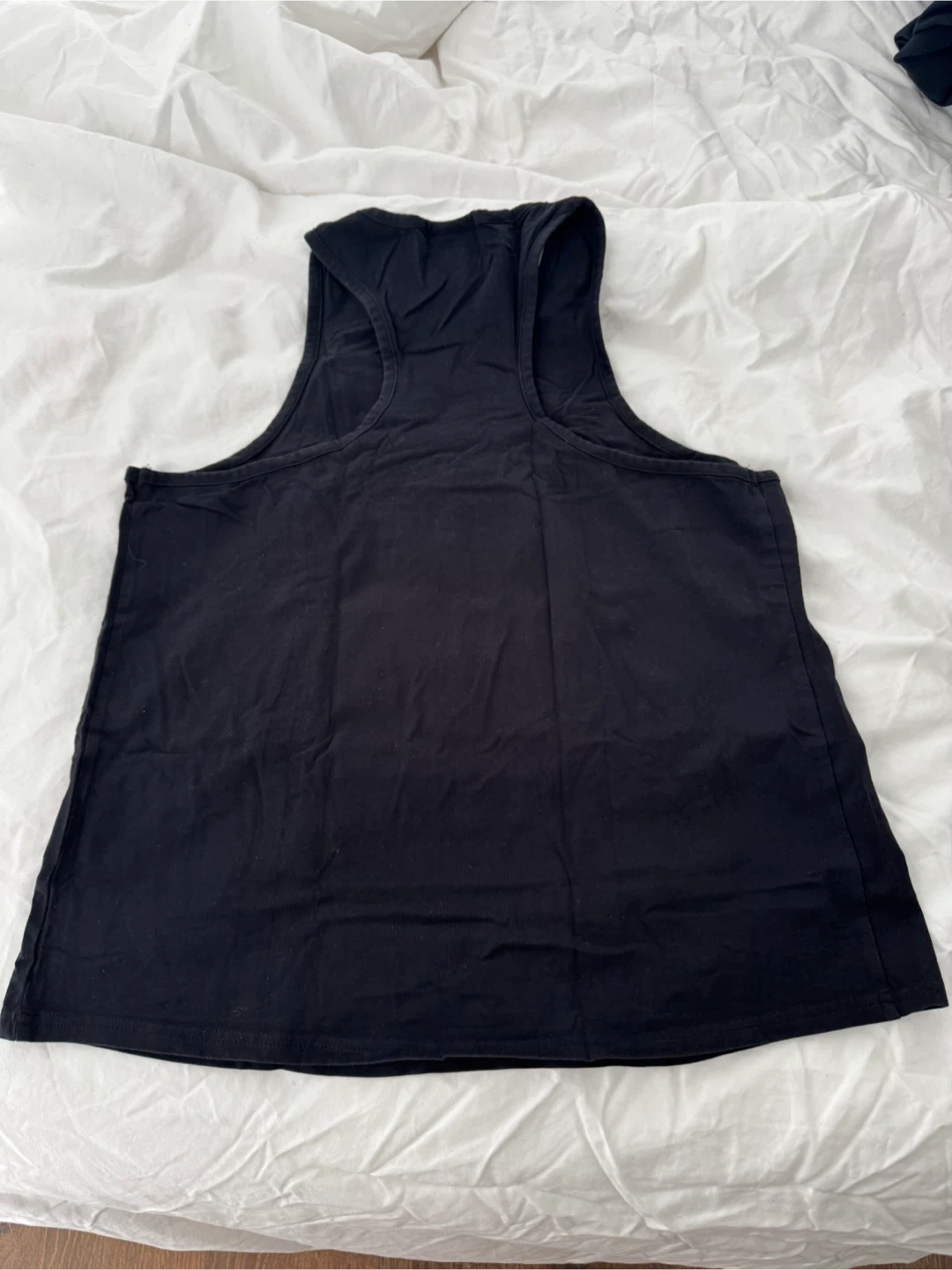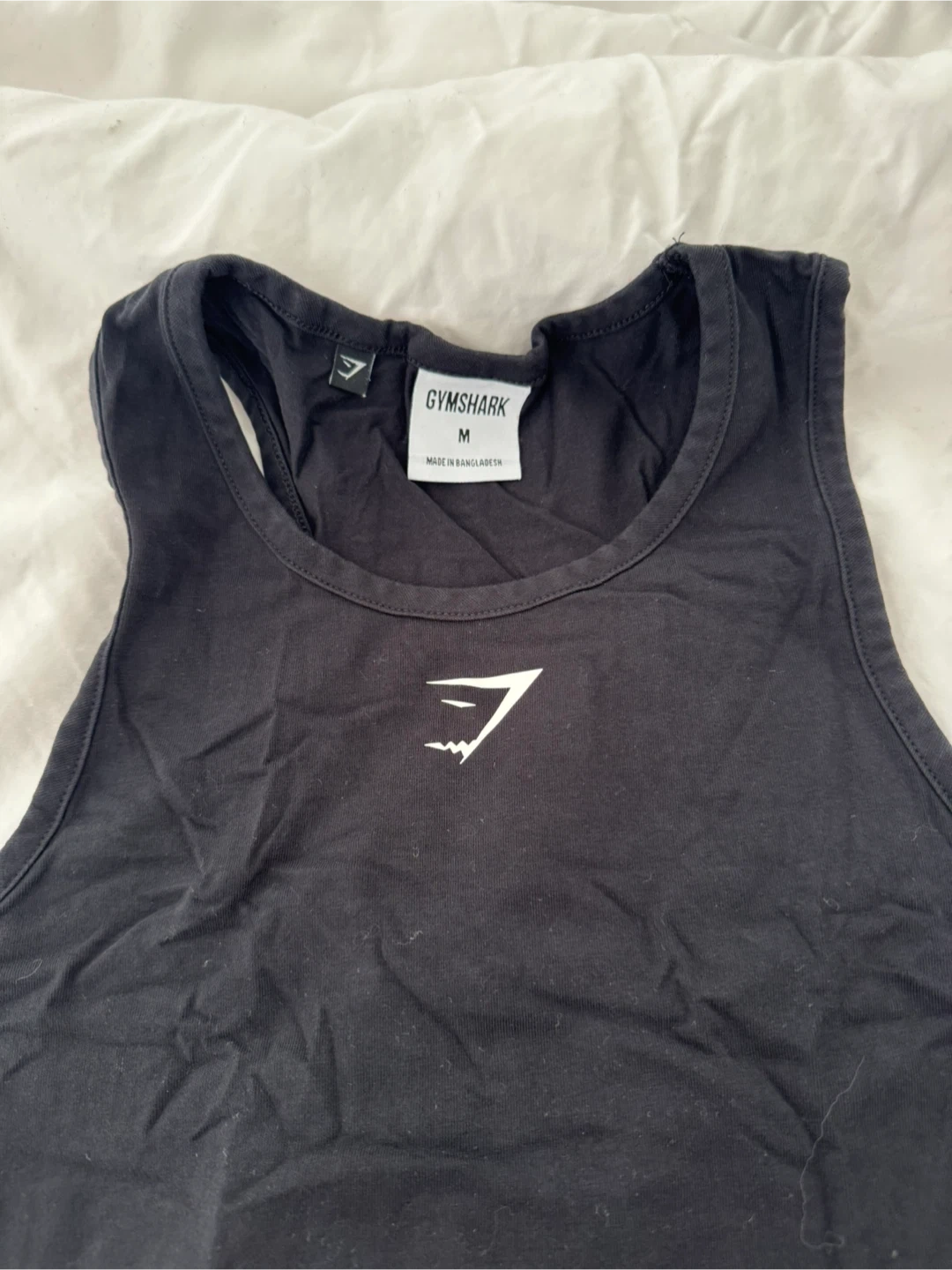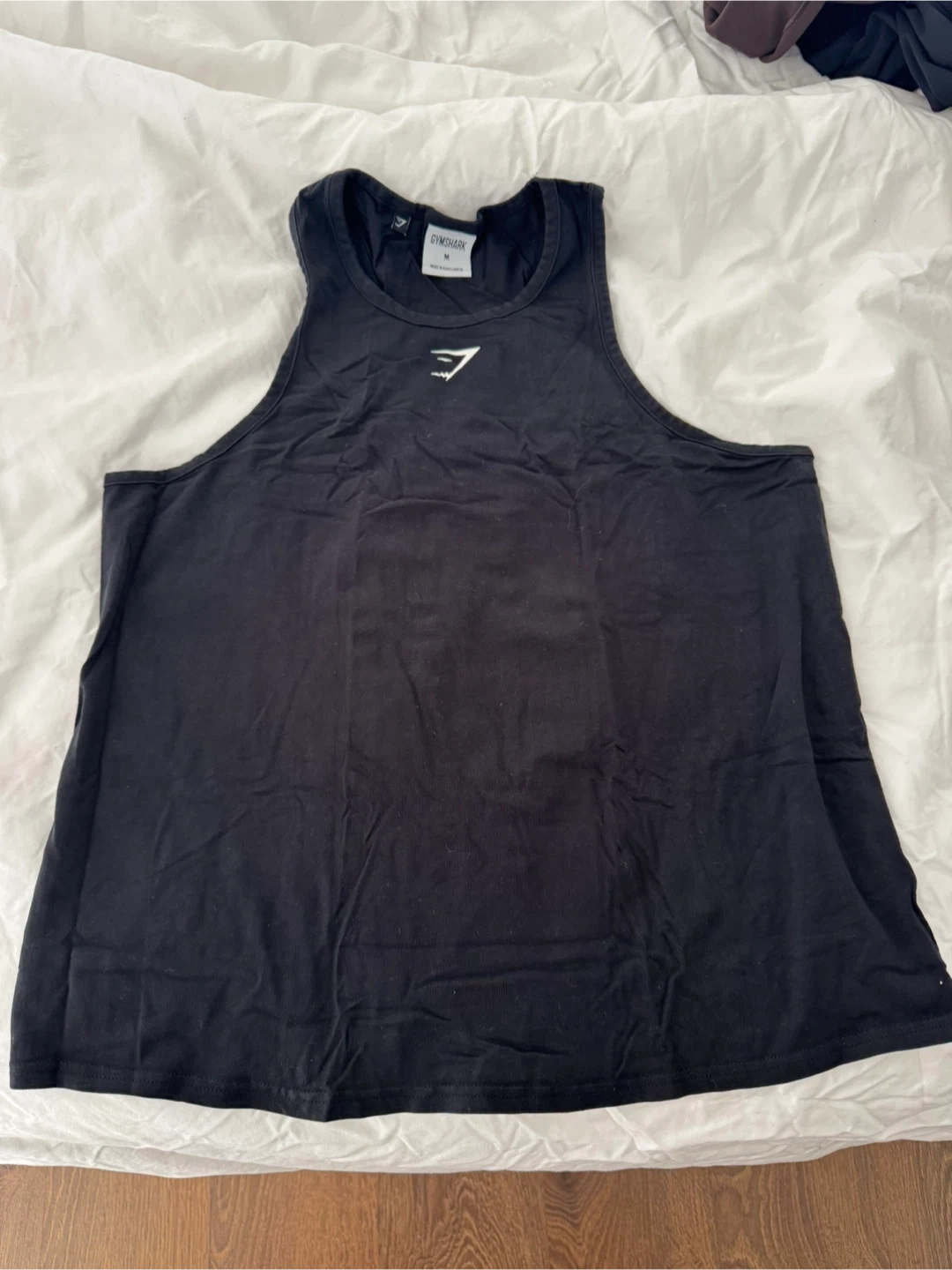 This is a black Gymshark tank top in size medium. It's made from a soft cotton blend for comfort during workouts. The racerback design allows for a full range of motion.