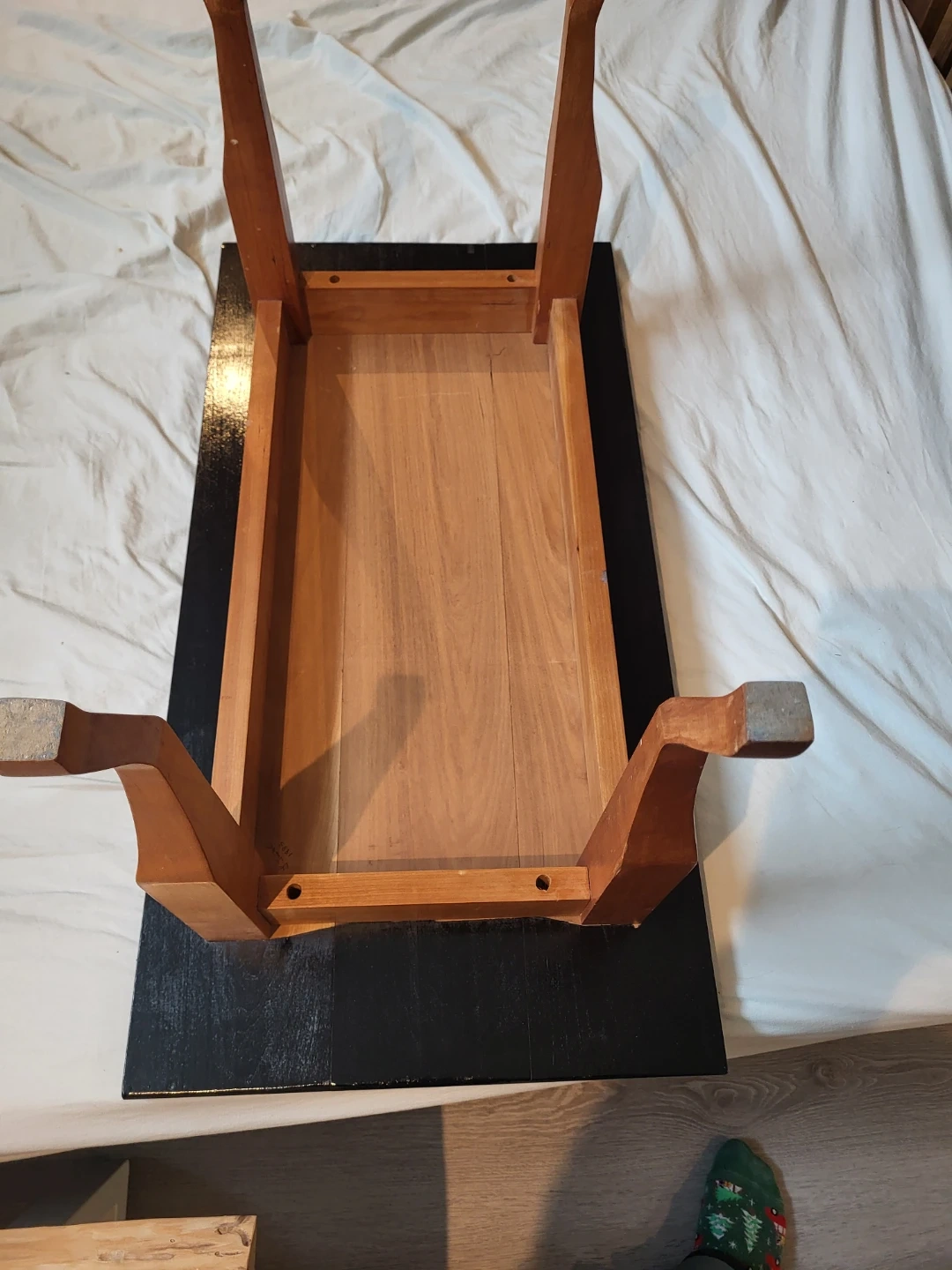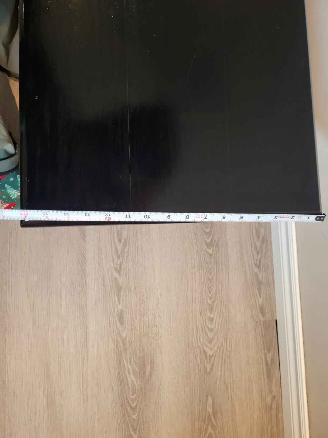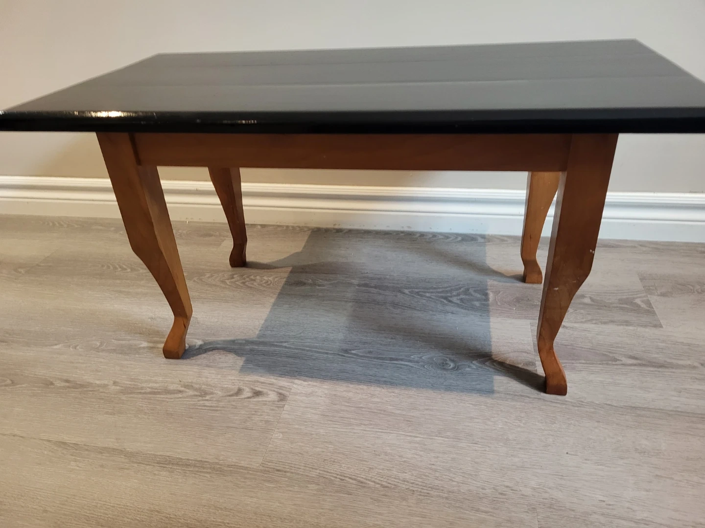 A rectangular coffee table with a glossy black top and natural wood legs. It measures approximately 30 inches long by 15 inches wide. This table's classic design makes it a versatile addition to any living space.