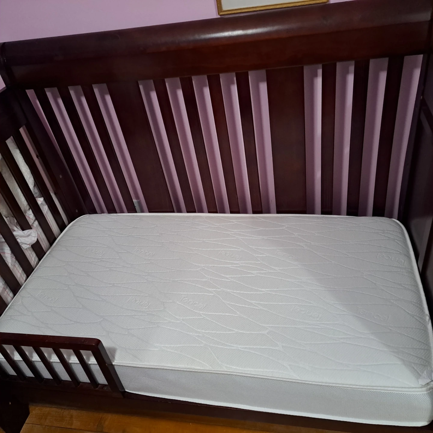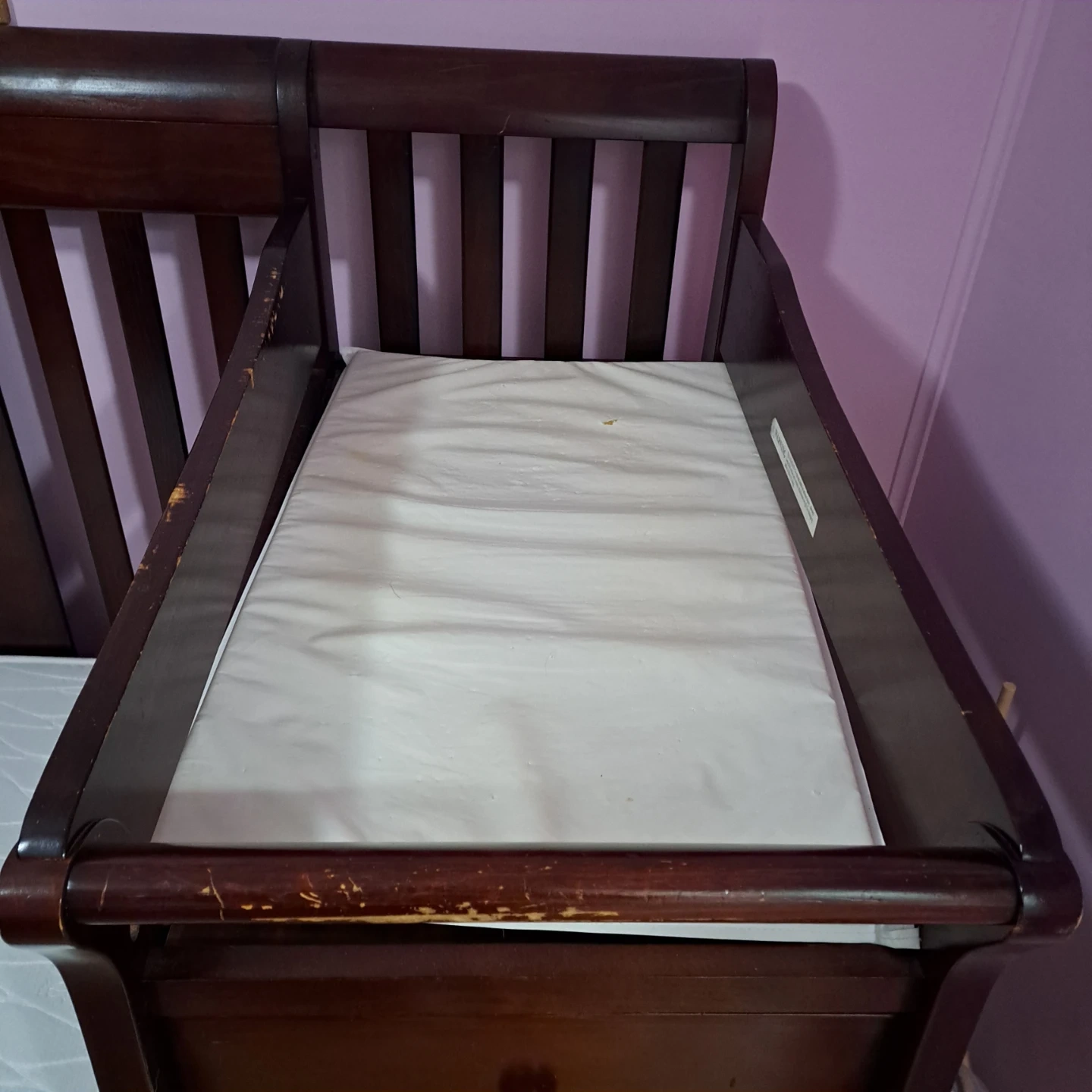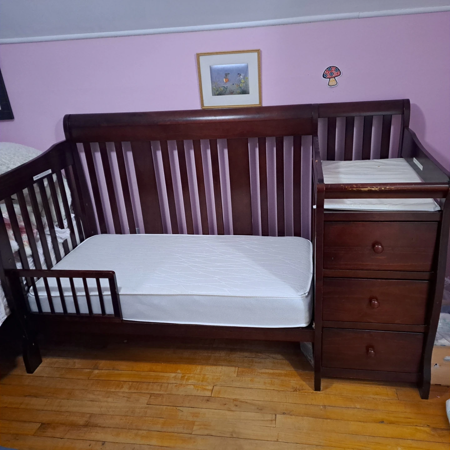 This wooden crib comes with an attached changing station, perfect for a nursery. It's a rich brown wood colour and includes a toddler rail conversion. It's a sturdy piece of baby furniture. All pieces for crib and toddler bed conversion available. Only slight scuffing on the change table rail, mostly great condition. Mattress is great. Changing pad is used condition but still good.