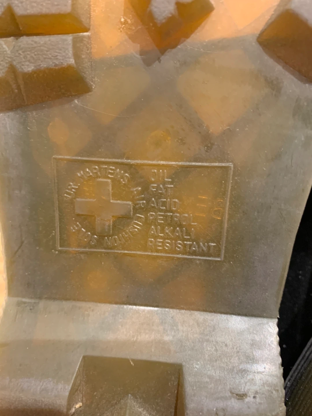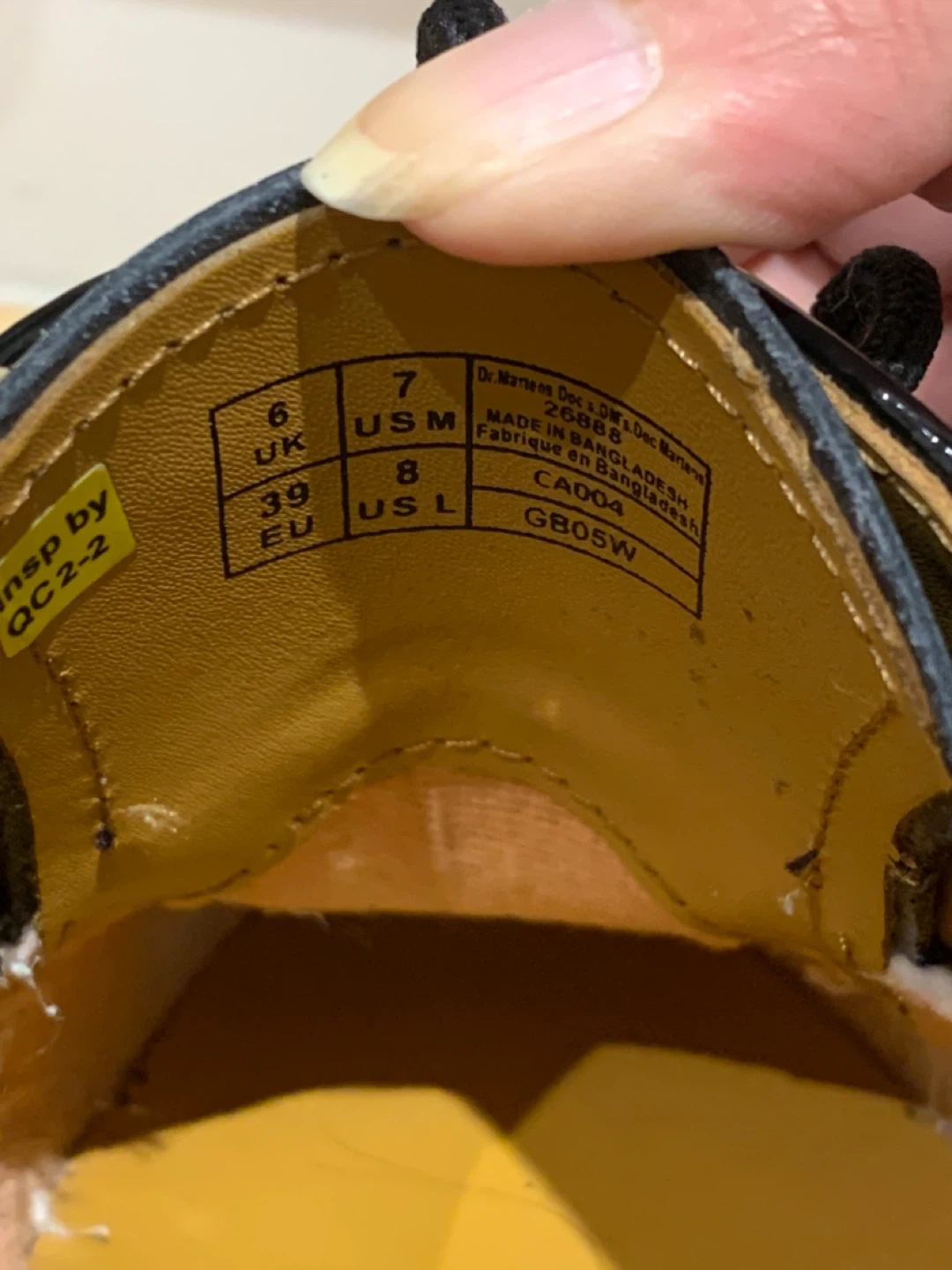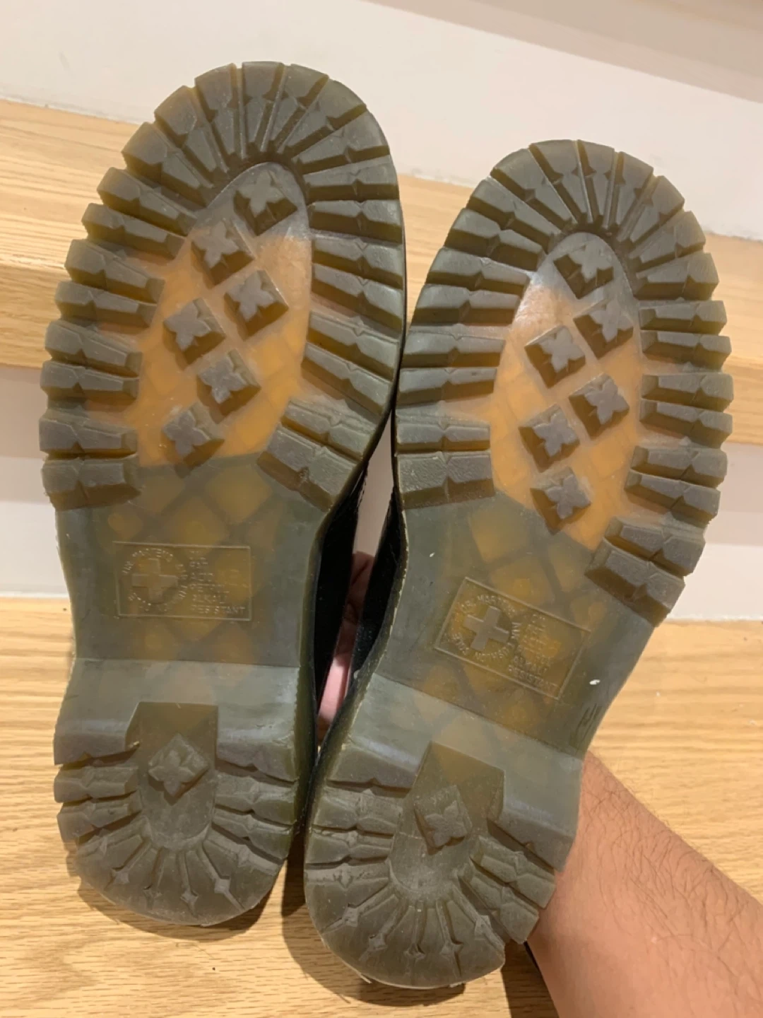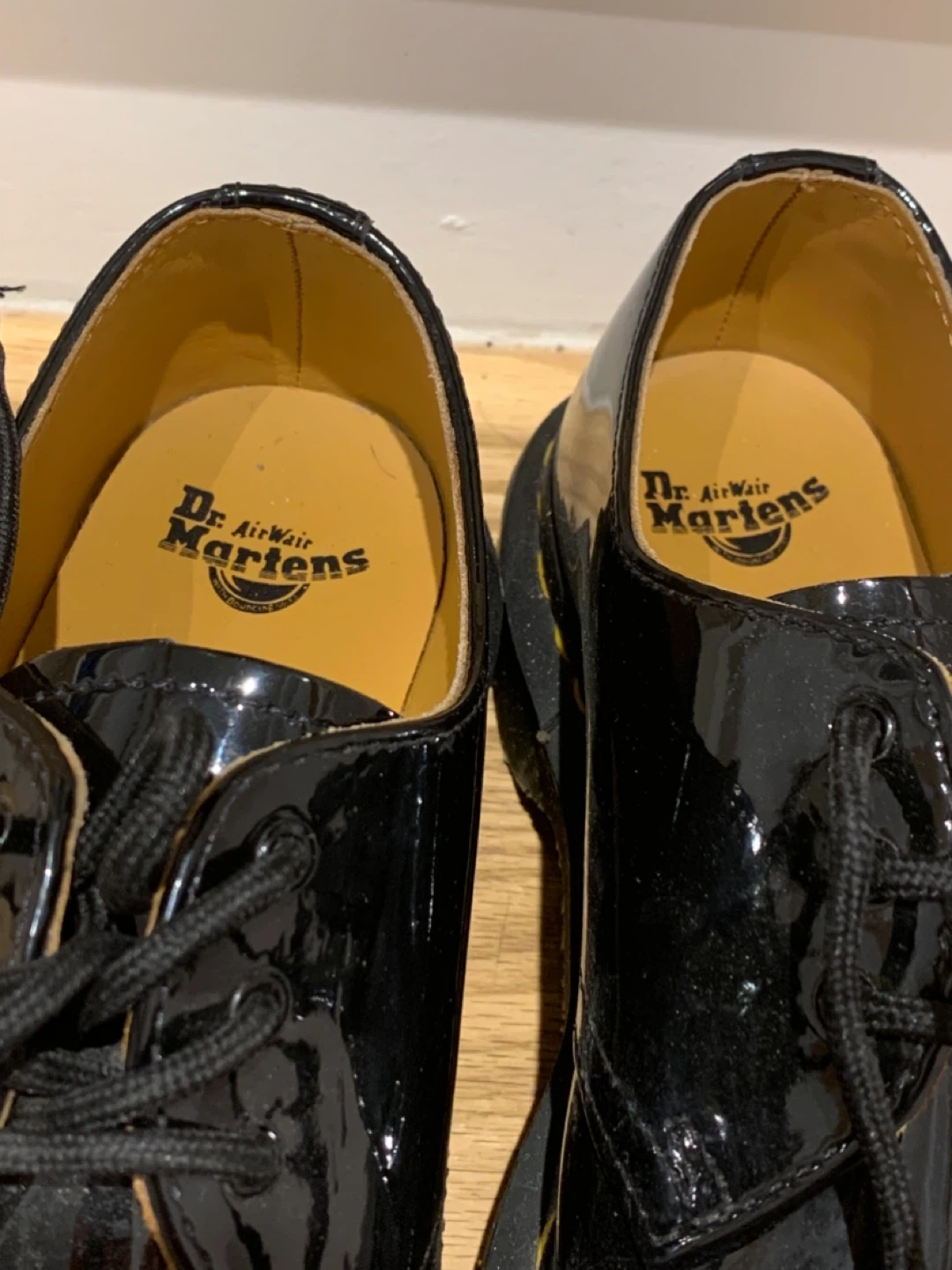 These Dr. Martens shoes are made of black patent leather. They're a Women's size US 8, which is a UK 6. The soles are oil, fat, acid, petrol, and alkali resistant.