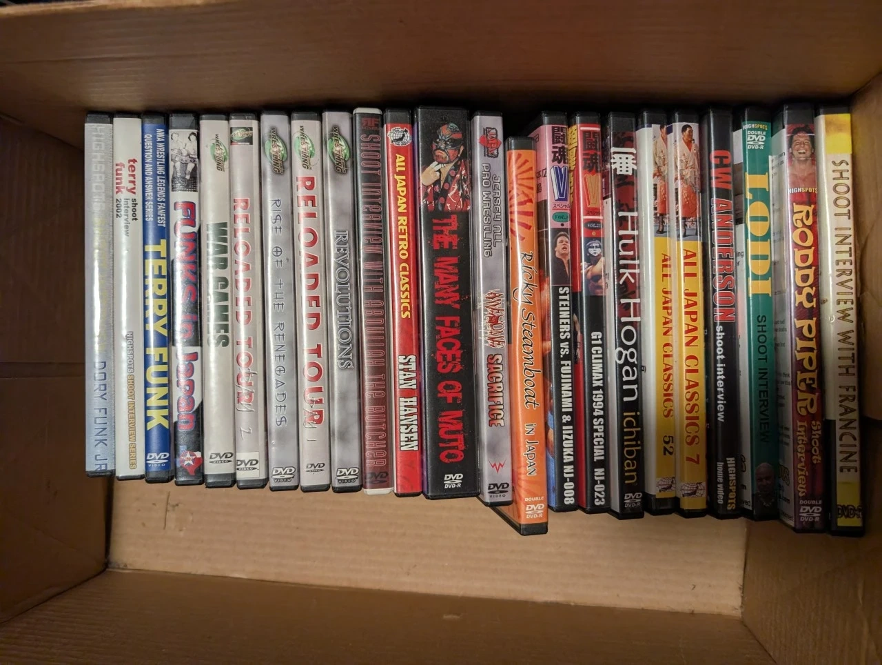 Collection of pro wrestling DVDs featuring various promotions and wrestlers. Includes titles like 'All Japan Classics', 'Hulk Hogan ichiban', and 'Shoot Interview' series. These are DVD format releases.