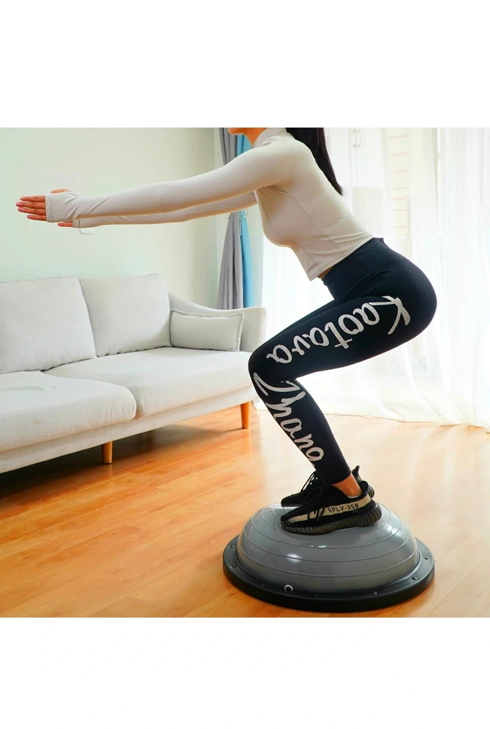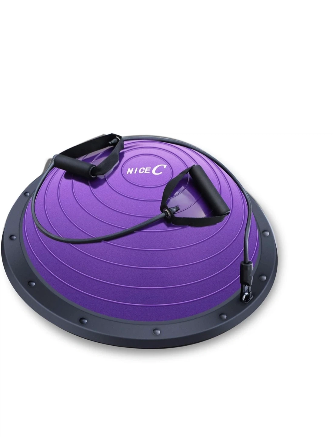 This purple balance ball is made of extra thick, non-toxic PVC with an anti-slippery surface and non-skid feet. It's 23 inches wide and 9 inches tall.