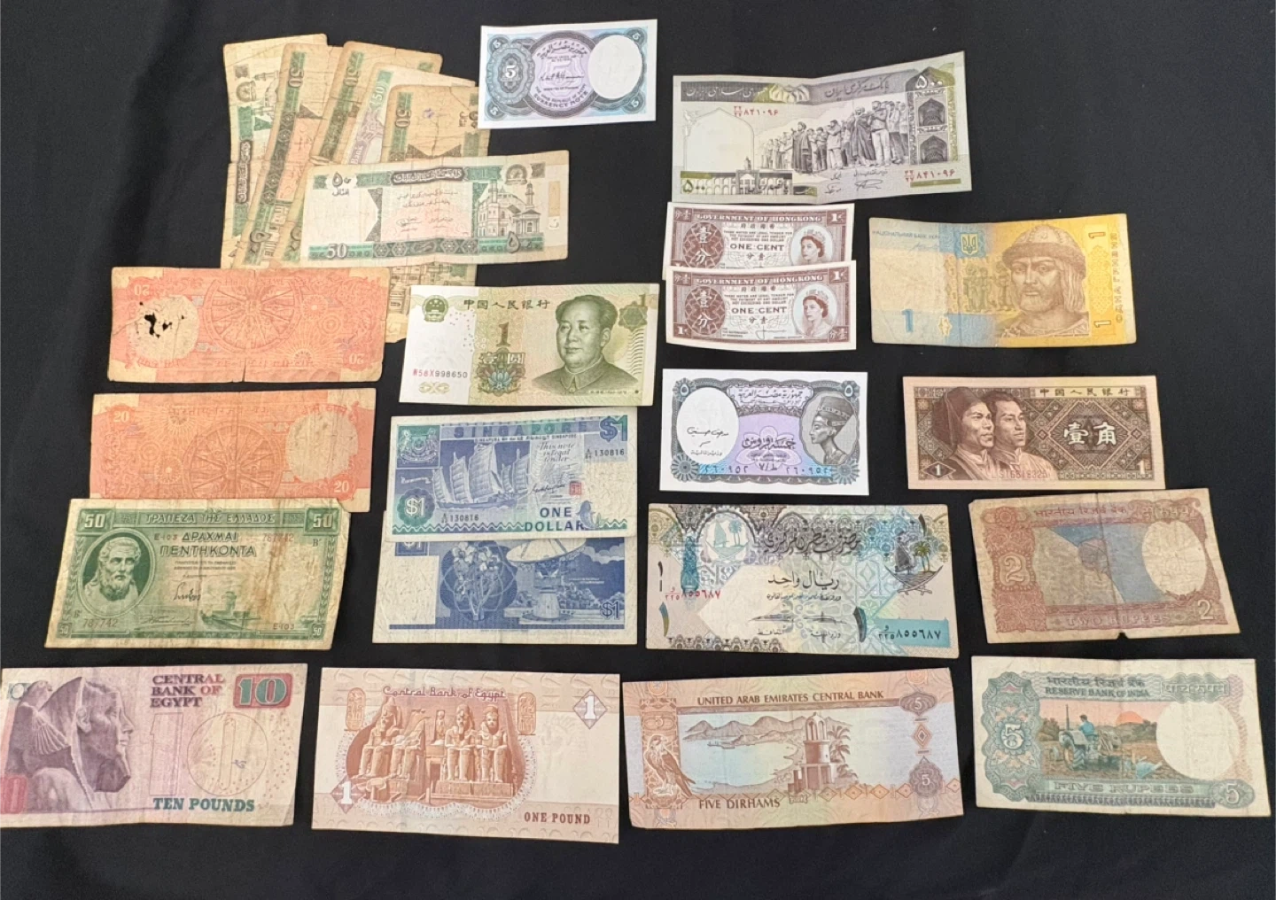 various international banknotes and some loose coins. Some notes are from Egypt, United Arab Emirates, Qatar, Iran, Afghanistan, etc...