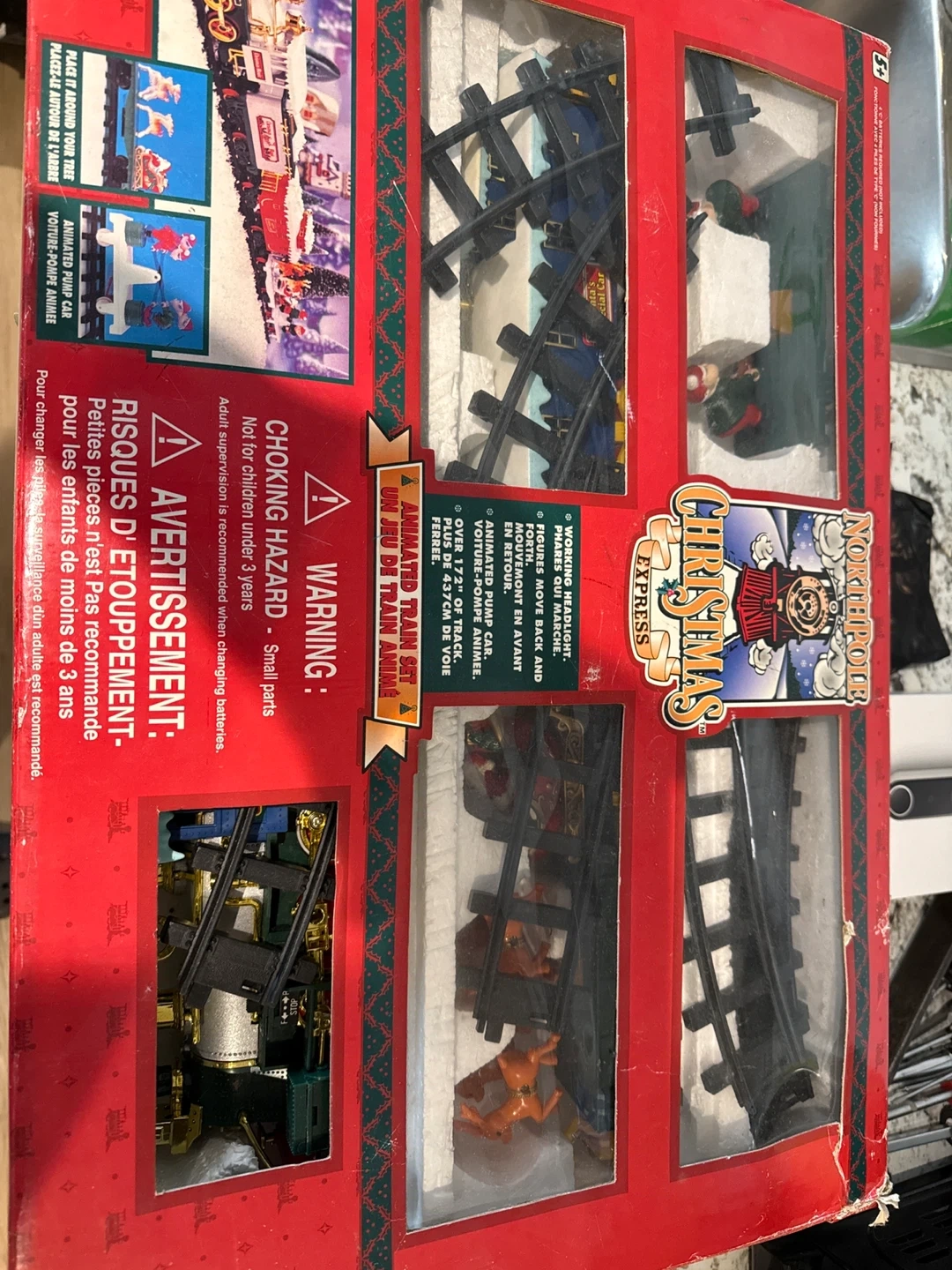 This North Pole Christmas Express train set comes with over 172" of track. It features a working headlight and animated pump car. Figures move back and forth for a fun holiday display.