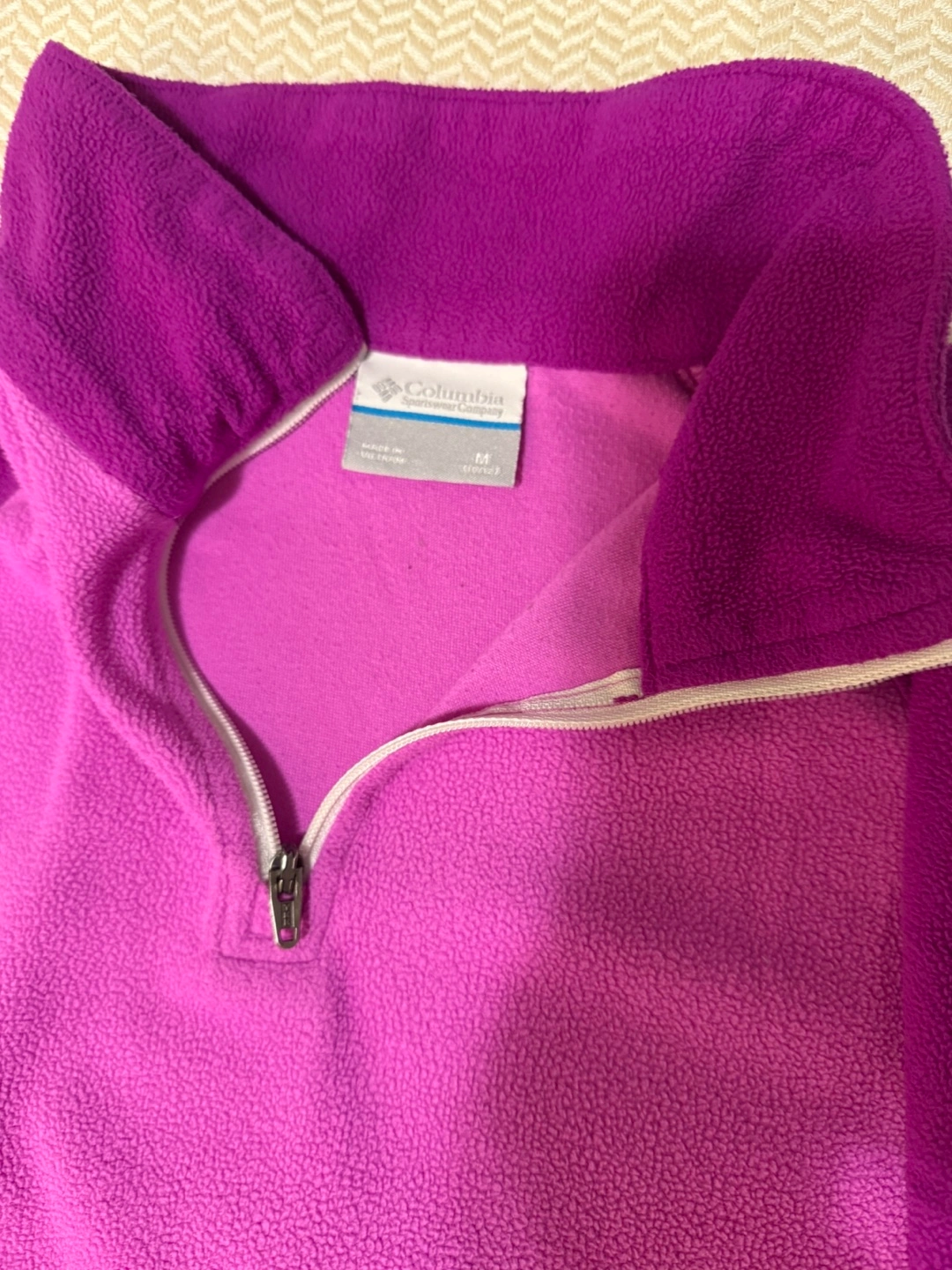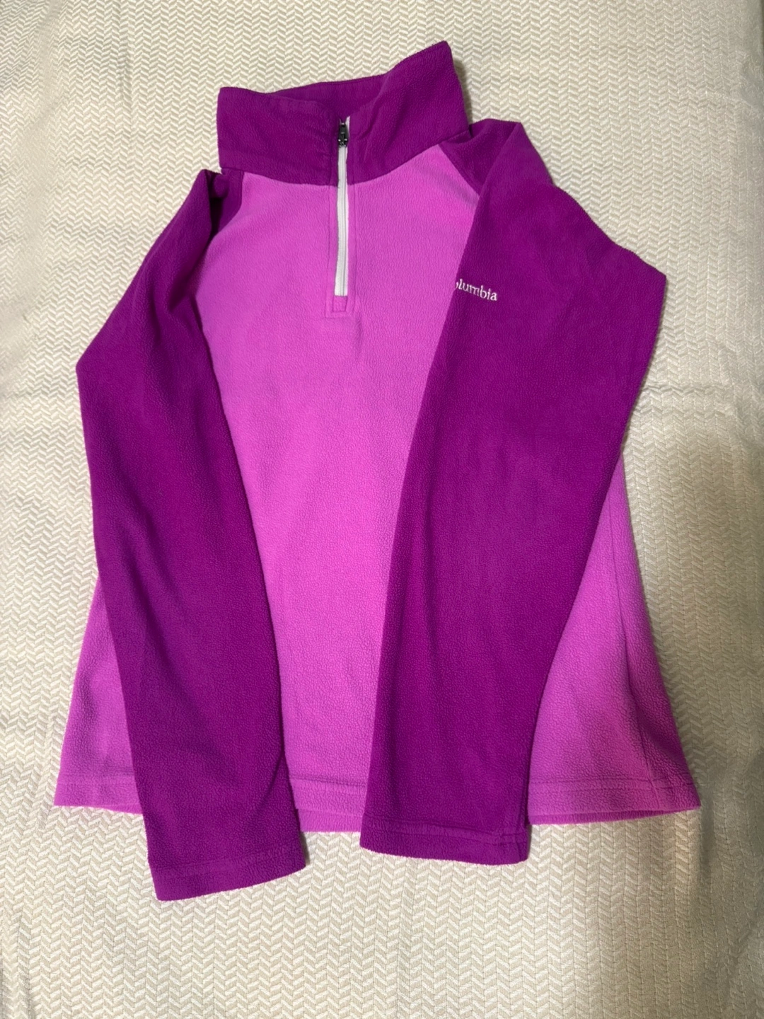 Columbia fleece pullover in two shades of purple. Size medium. Soft fleece material for warmth.