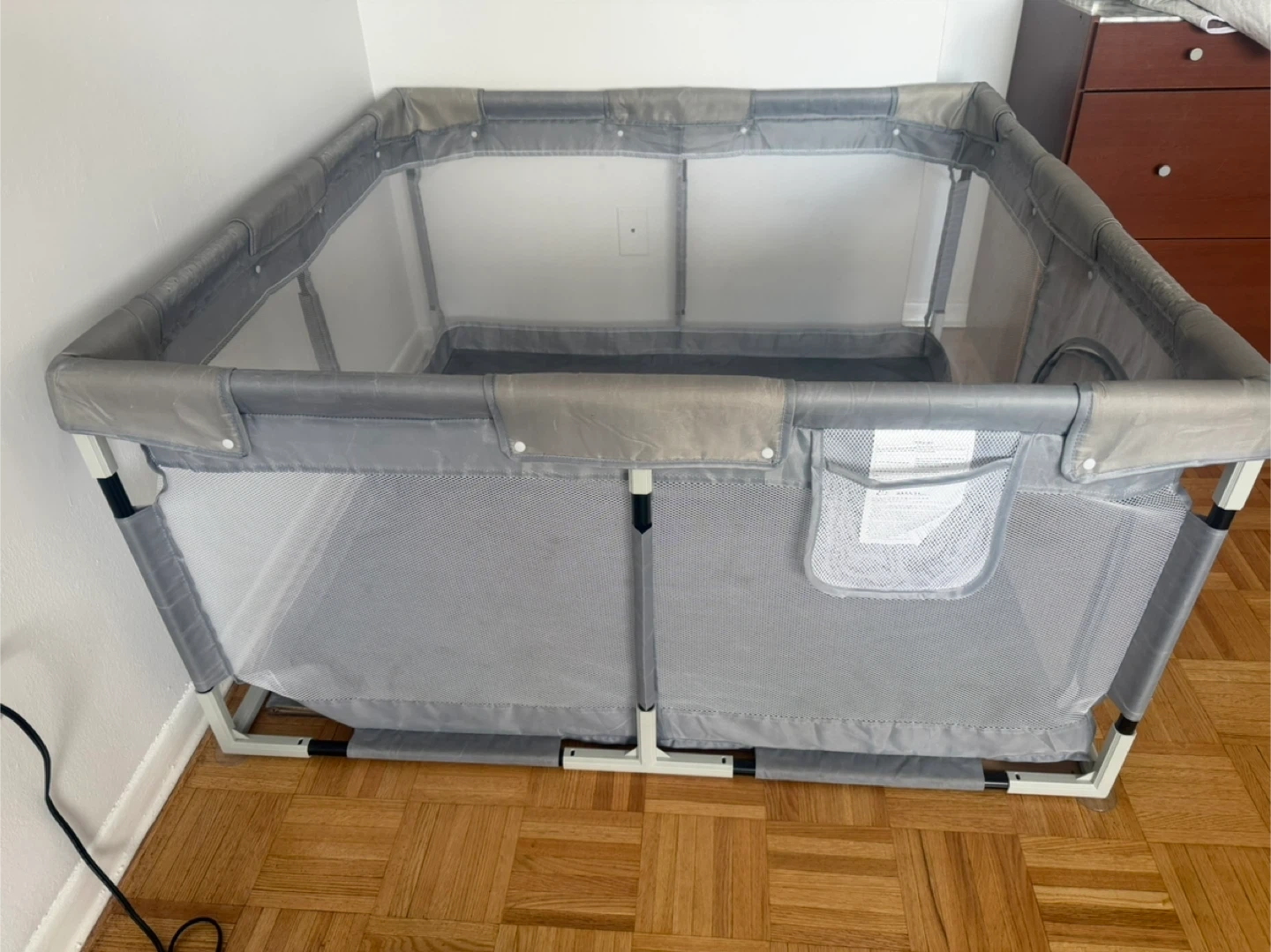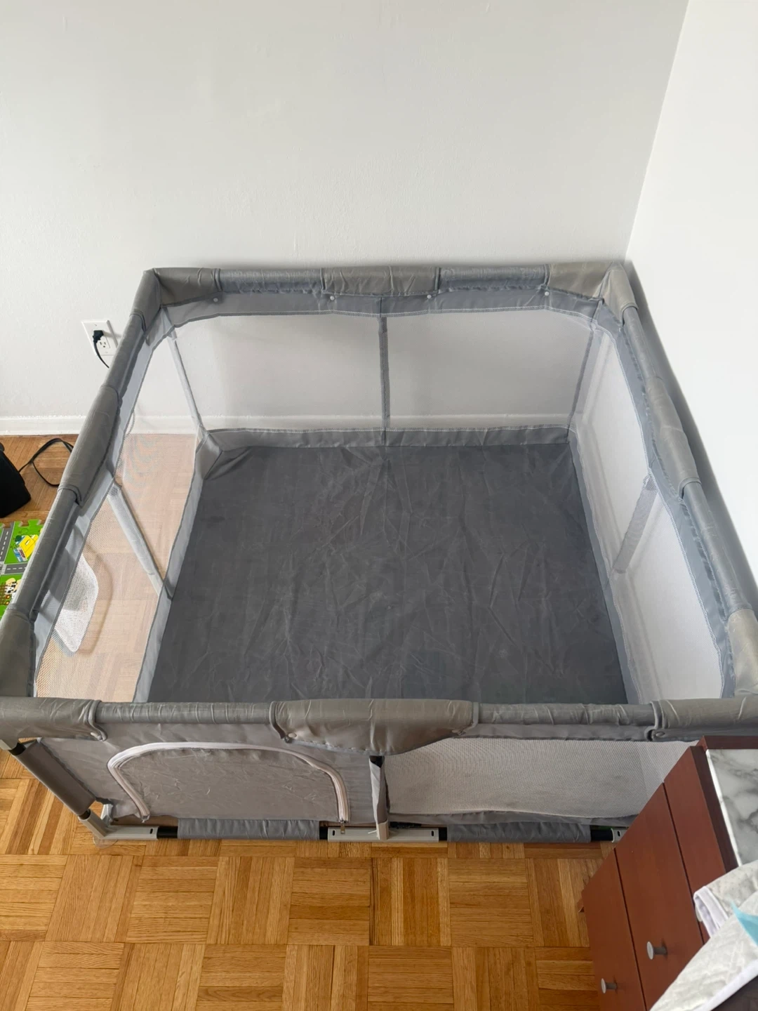 It's made with a sturdy frame and mesh sides for visibility. It has a zippered door for easy access. This playpen is great for keeping little ones safe and entertained.