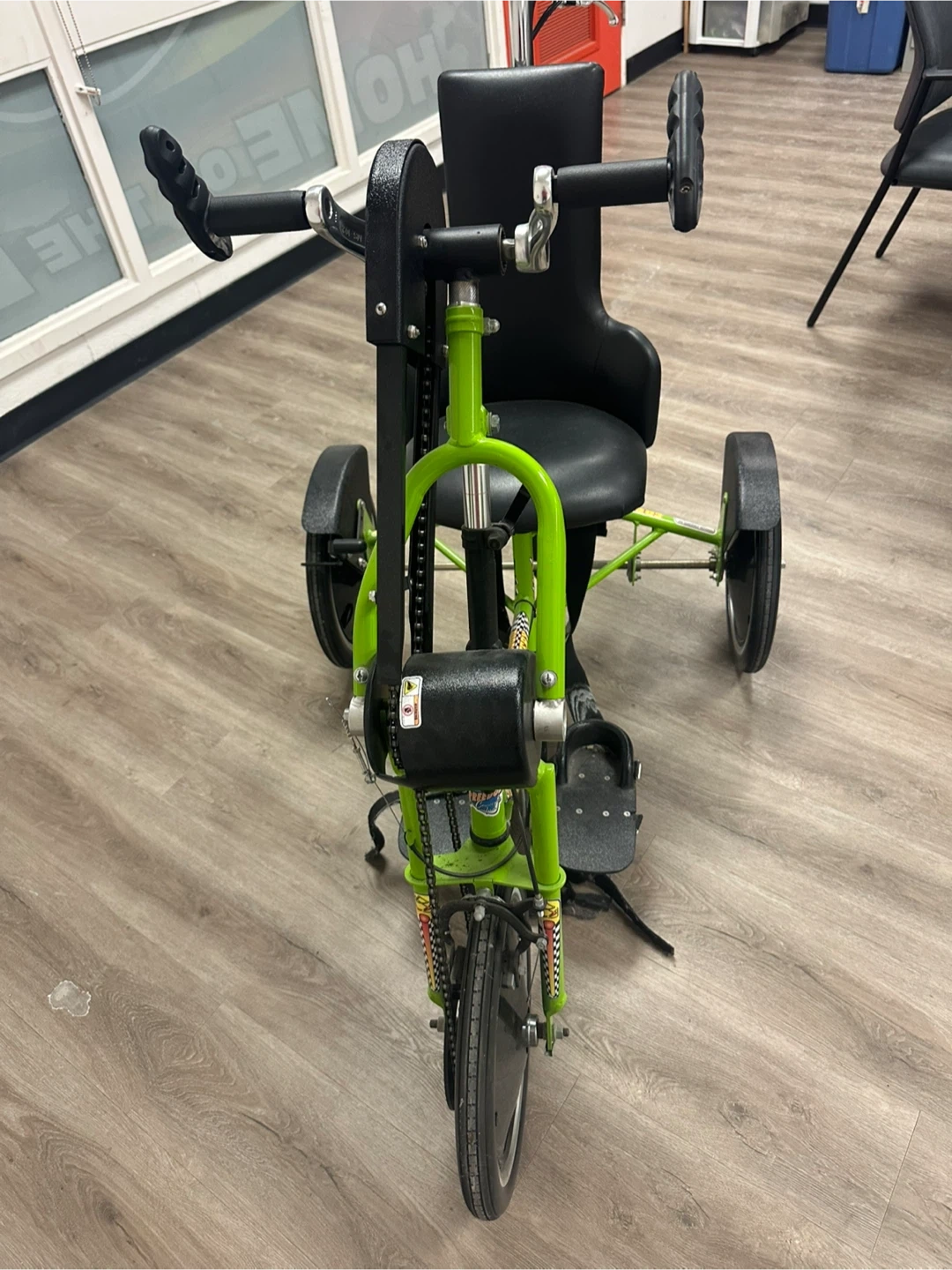This adaptive tricycle is designed to assist with mobility. It features a comfortable seat and hand-operated controls for steering and braking. The sturdy frame ensures stability for riders.
